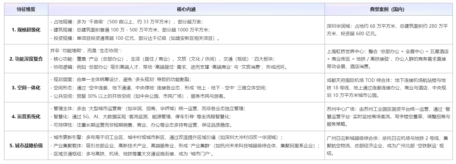 超级综合体的 “超级性” 体现在规模、功能、空间、运营、城市价值五大维度,具体特征如下表所示: