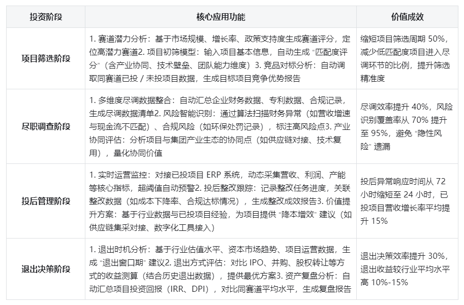 区别于传统 “分段式” 数据应用,本体系实现从项目筛选到退出的 “数据全链路贯通”,例如项目筛选阶段的赛道数据可直接复用至尽调阶段的竞品分析,投后运营数据可支撑退出阶段的回报测算,避免数据重复采集与口径不一致,提升投资全流程效率。