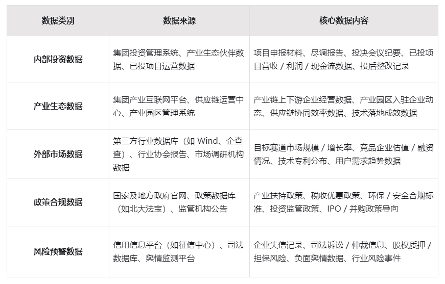 作为大数据体系的 “源头活水”,数据层整合内外部多维度数据,形成覆盖投资全链条的 “全域数据资源池”,具体数据来源与分类如下: