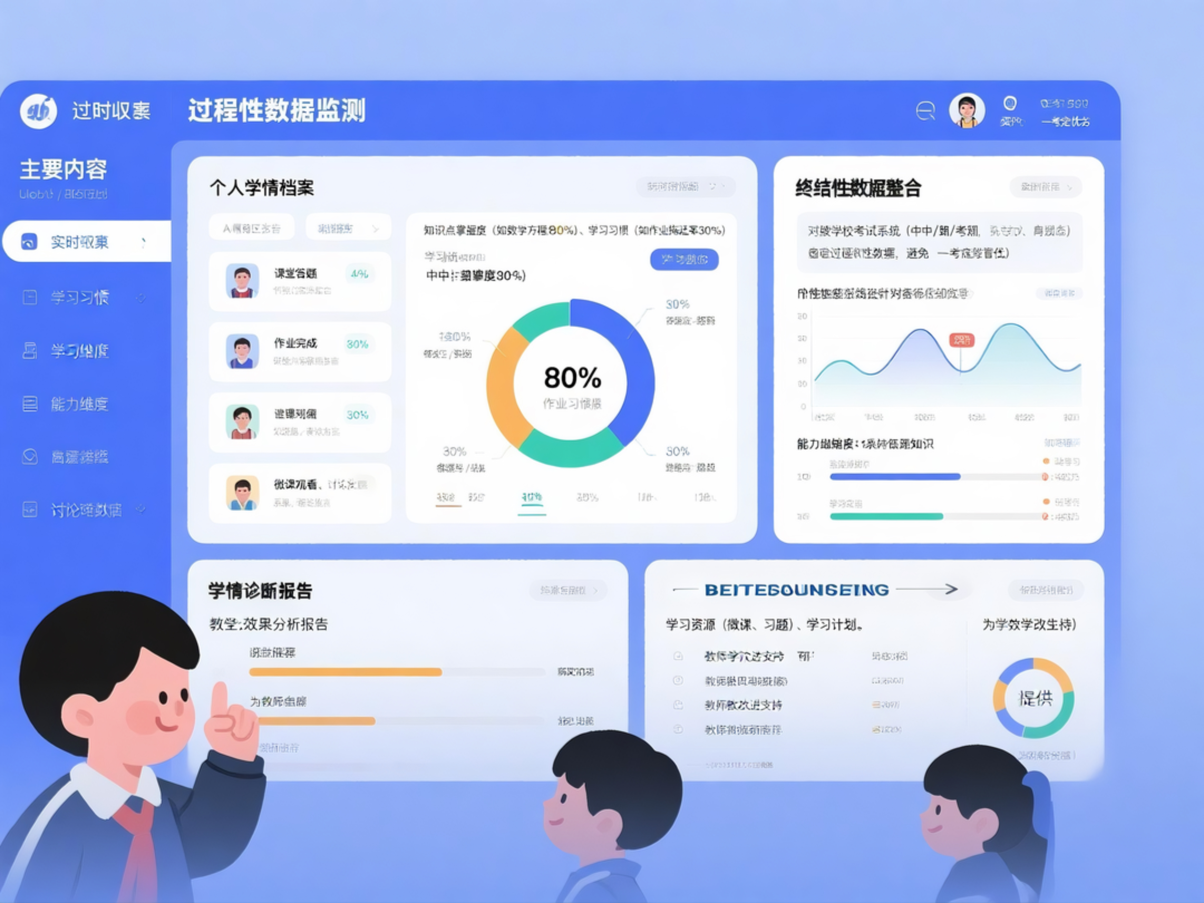 终结性数据整合:对接学校考试系统(期中 / 期末 / 模拟考),自动录入成绩,结合过程性数据,避免 “一考定优劣”,全面评估学生学习状态。