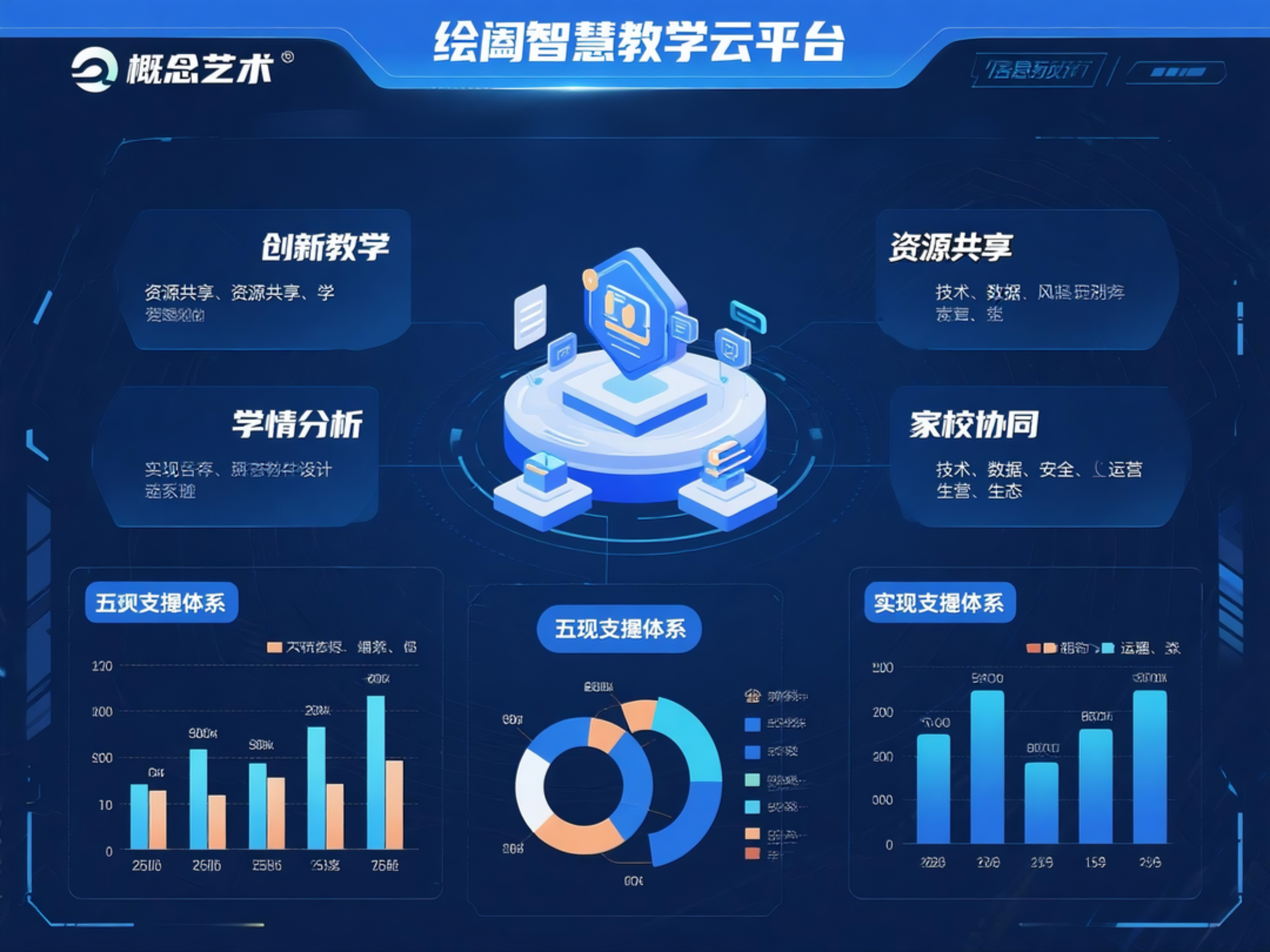 方案以 “绘阖智慧教学云平台” 为核心中枢,联动 “创新教学、资源共享、学情分析、家校协同” 四大功能翼,通过 “技术、数据、安全、运营、生态” 五大支撑体系,实现全学段、全教学周期智慧化覆盖: