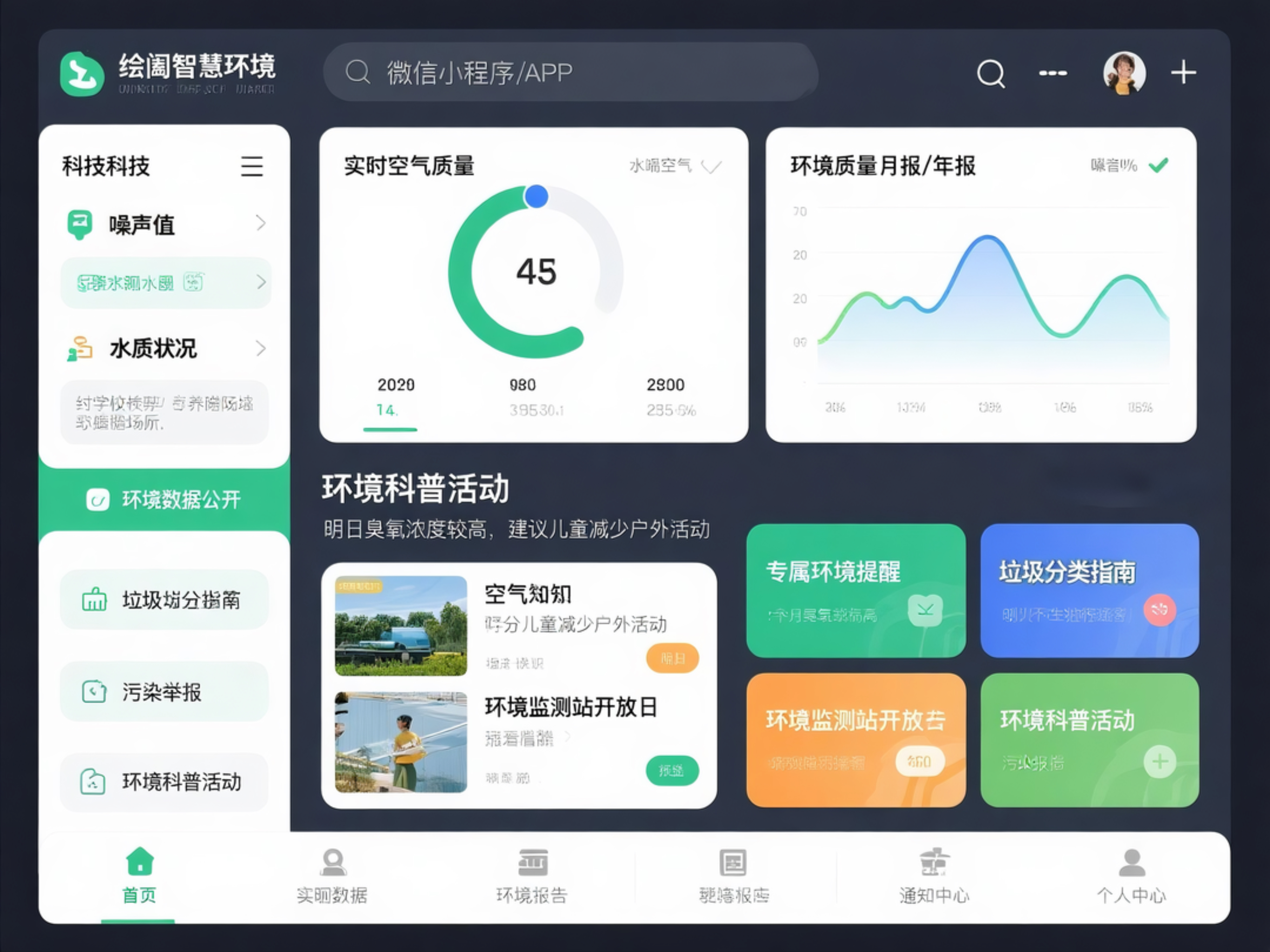 开发 “绘阖智慧环境” 微信小程序 / APP,公众可查询 “实时空气质量、水质状况、噪声值”(如 “XX 公园今日 PM2.5 浓度 35μg/m³,空气质量优”),查看 “环境质量月报 / 年报”,了解区域环境趋势;