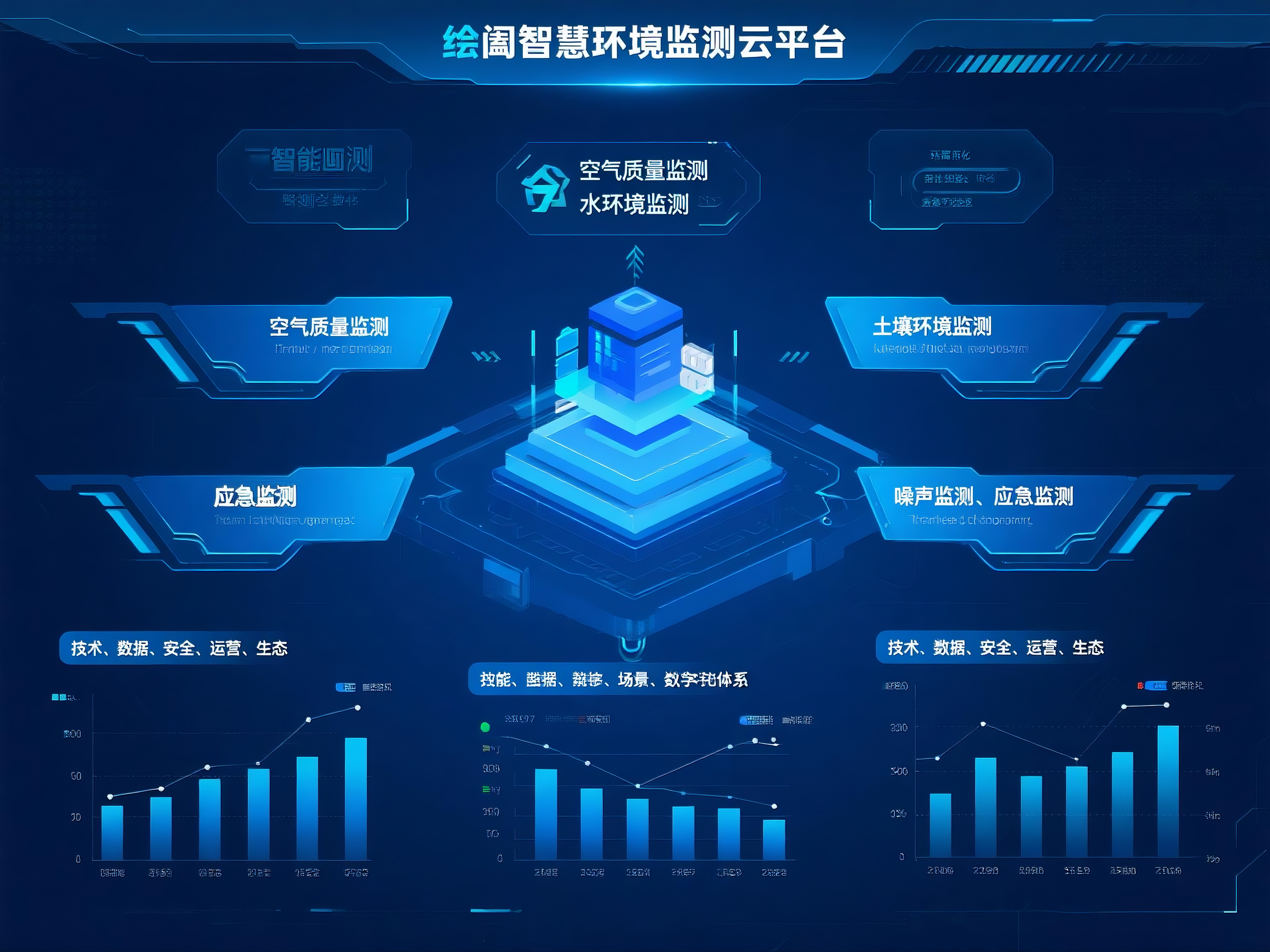 方案以 “绘阖智慧环境监测云平台” 为核心中枢,联动 “空气质量监测、水环境监测、土壤环境监测、噪声监测、应急监测” 五大功能翼,通过 “技术、数据、安全、运营、生态” 五大支撑体系,实现环境监测全场景数字化覆盖: