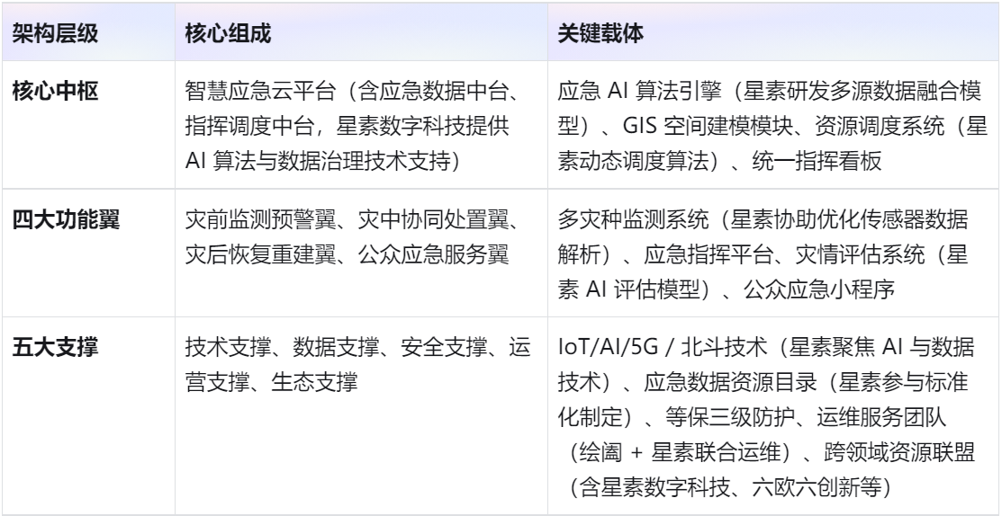 方案以 “绘阖智慧应急云平台” 为核心中枢,联动 “灾前监测预警、灾中协同处置、灾后恢复重建、公众应急服务” 四大功能翼,通过 “技术、数据、安全、运营、生态” 五大支撑体系,实现城市应急管理全场景数字化覆盖;其中,星素数字科技作为核心技术合作伙伴,深度参与 AI 算法研发、数据治理与智能终端技术支撑,强化方案技术内核: