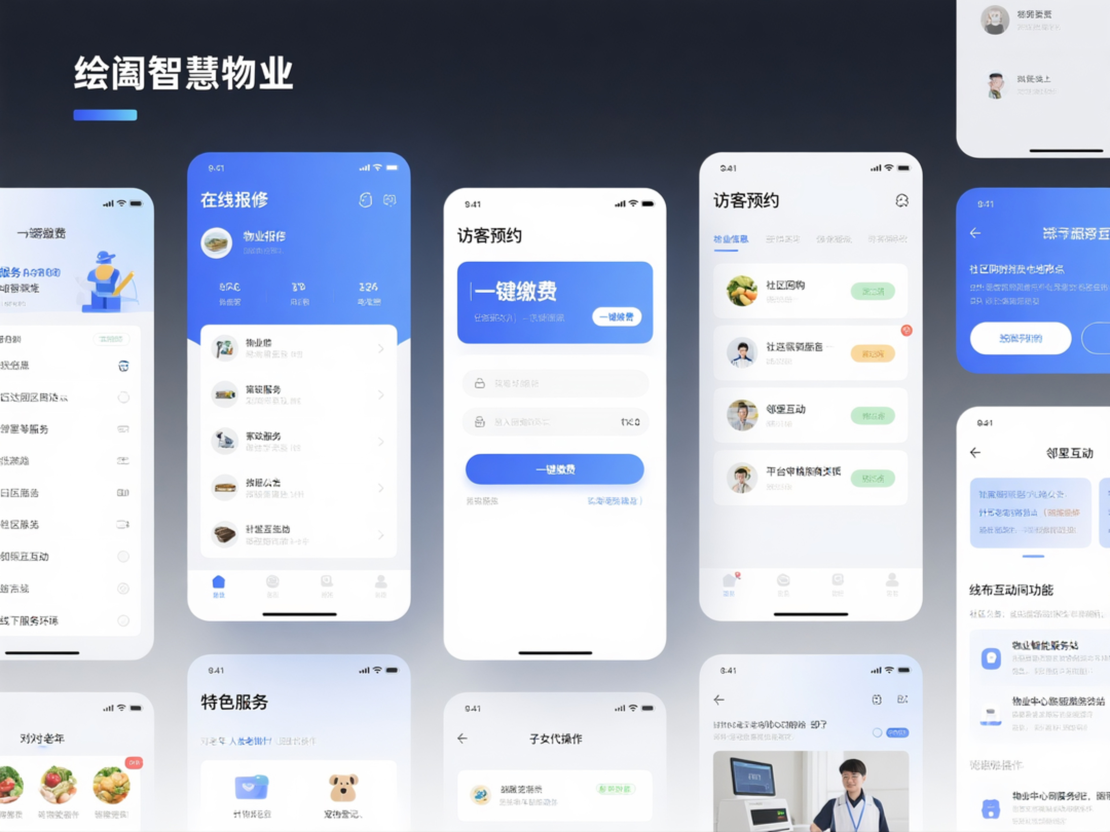 “绘阖智慧物业” APP / 小程序(六欧六创新设计,适配老年人 “大字版” 与年轻人 “精简版”,支持语音交互):