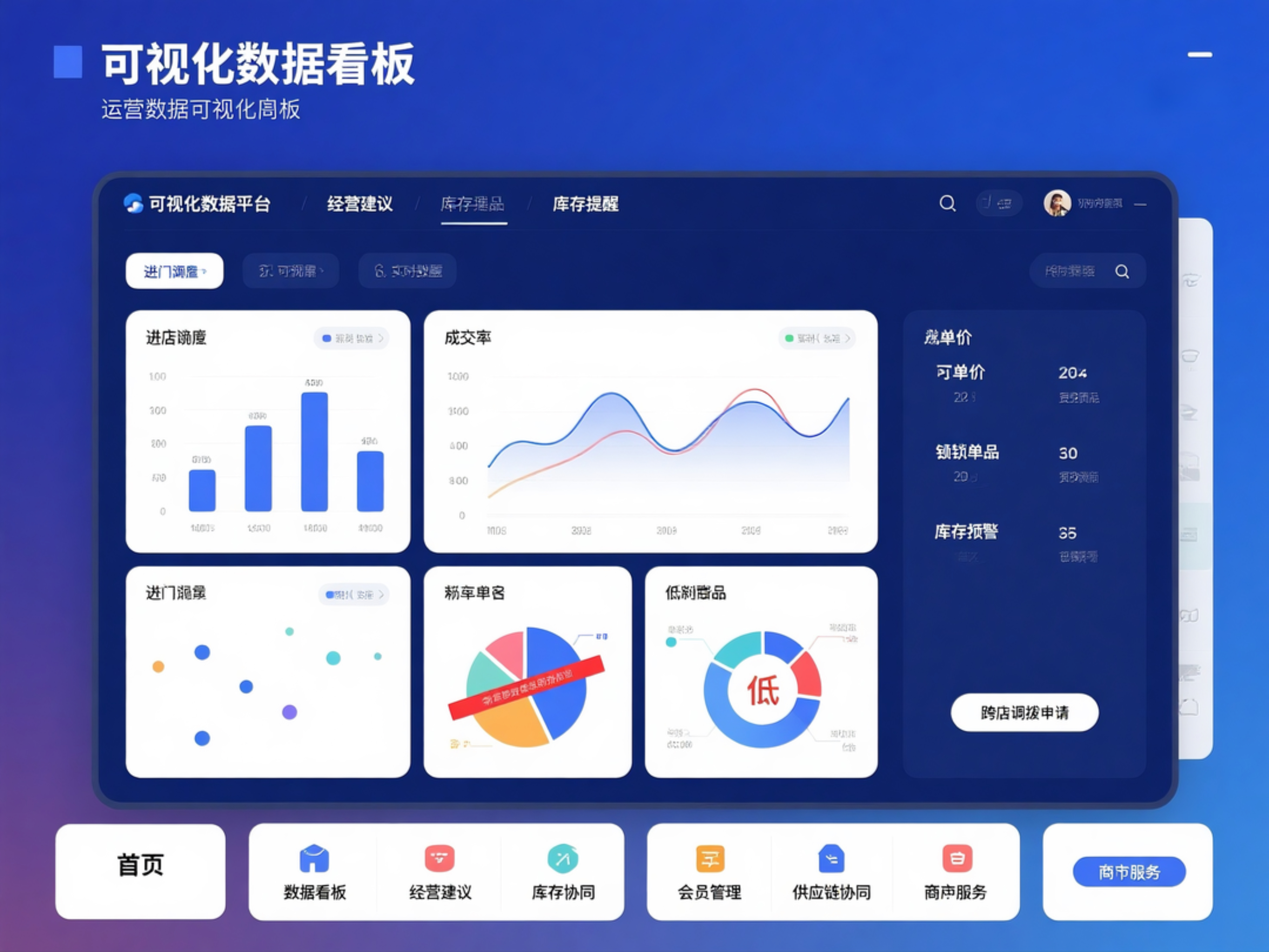 经营数据共享平台:为商户提供 “可视化数据看板”,实时展示 “进店客流、成交率、客单价、热销单品、库存预警”: