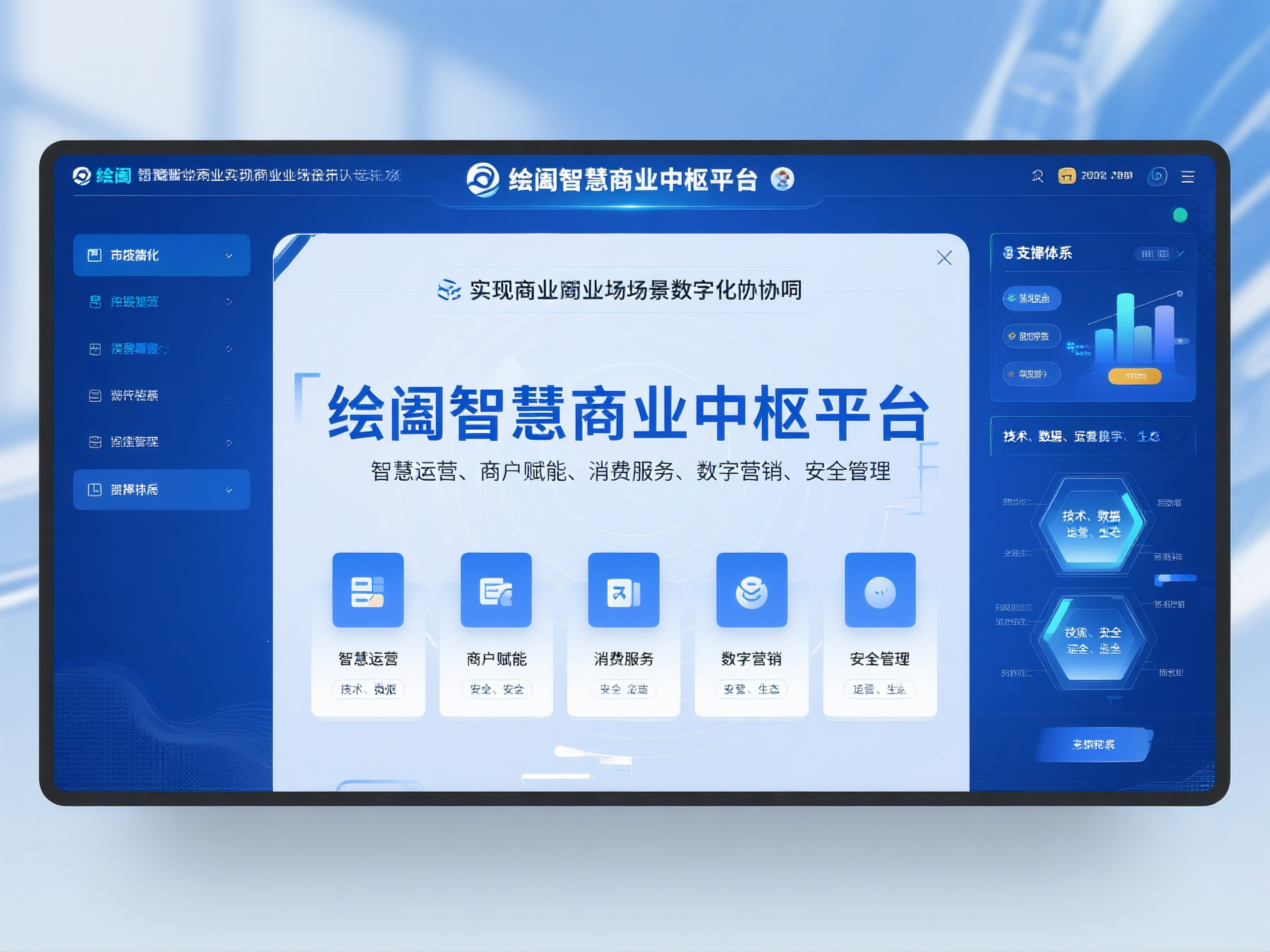 方案以 “绘阖智慧商业中枢平台” 为核心,联动 “智慧运营、商户赋能、消费服务、数字营销、安全管理” 五大功能翼,通过 “技术、数据、安全、运营、生态” 五大支撑体系,实现商业全场景数字化协同: