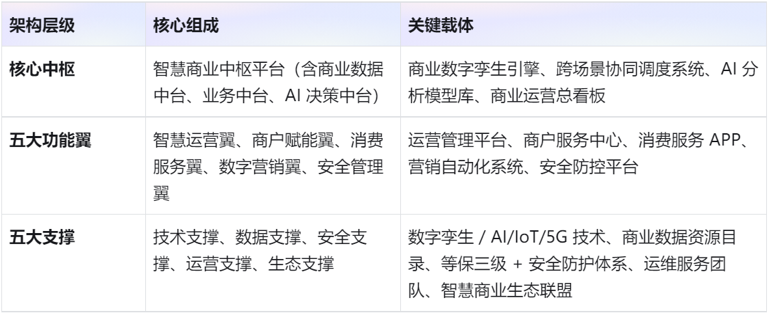 二、总体架构:“一核五翼五支撑”,构建智慧商业中枢生态