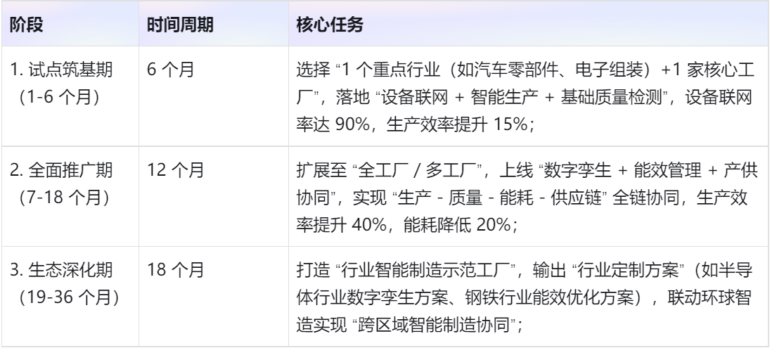 人员培训:分层开展培训(管理层:智能制造战略与决策培训;技术层:平台操作与数据分析师培训;一线层:设备操作与维保培训),确保各角色熟练应用;