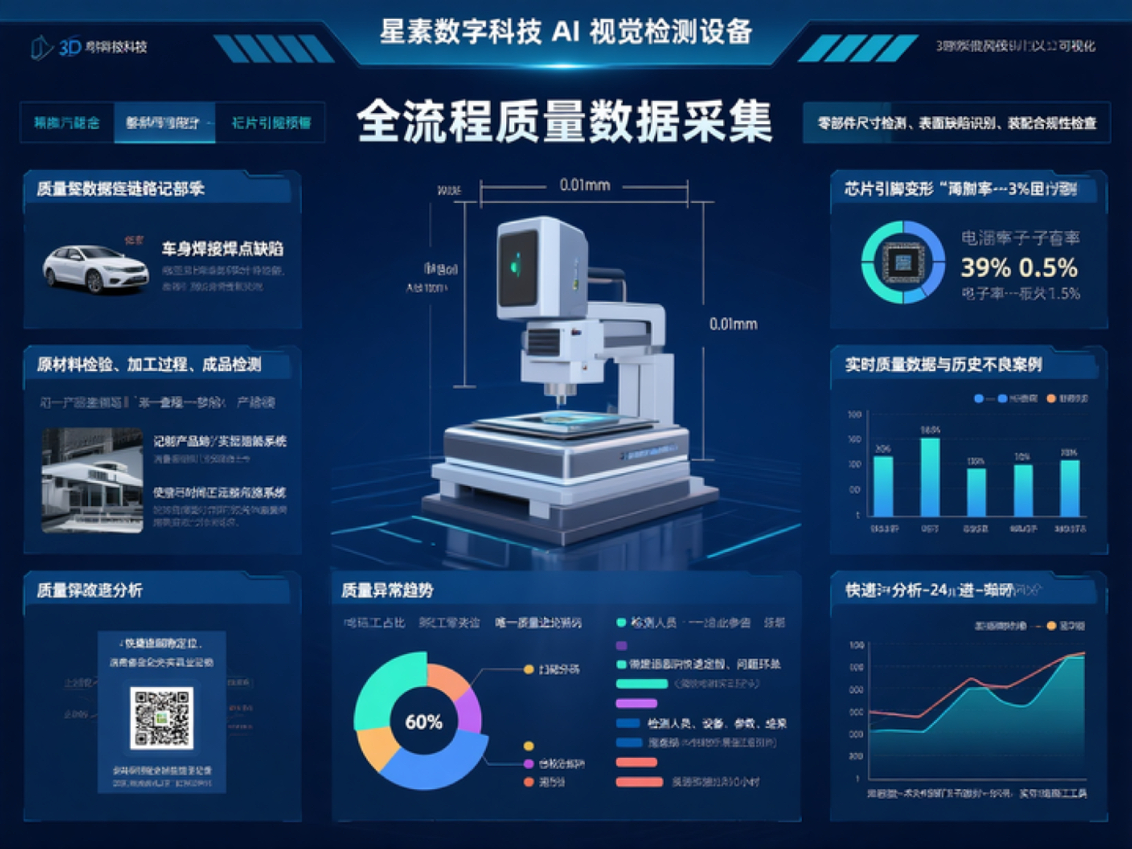 实时质量检测:部署 “星素数字科技 AI 视觉检测设备”(精度达 0.01mm),覆盖 “零部件尺寸检测、表面缺陷识别、装配合规性检查”: