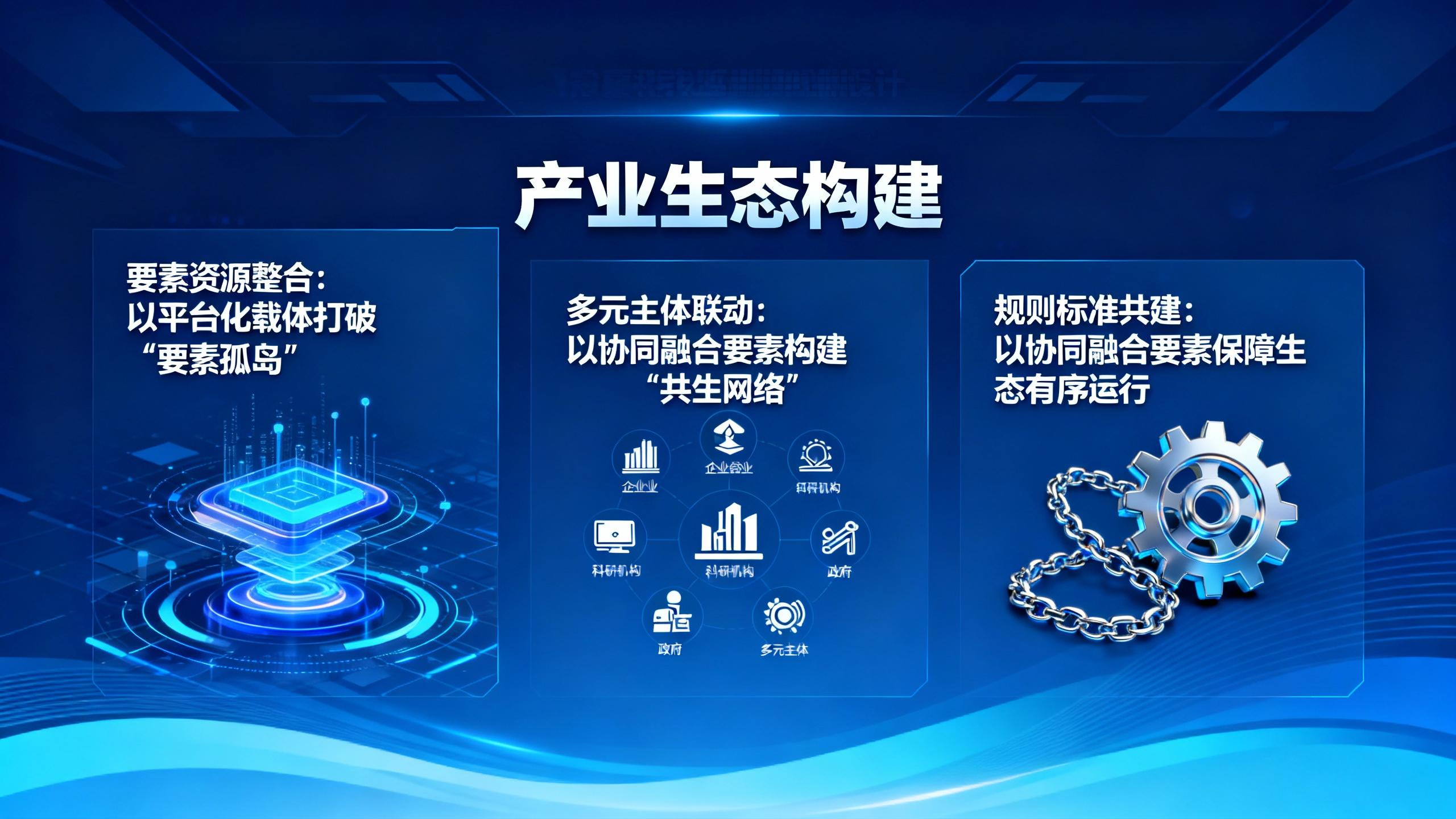 要素整合是核心:无论是传统产业还是新兴产业,都需打破要素 “分散应用” 的局限,通过平台化载体实现 “技术、模式、生态” 要素的系统整合;