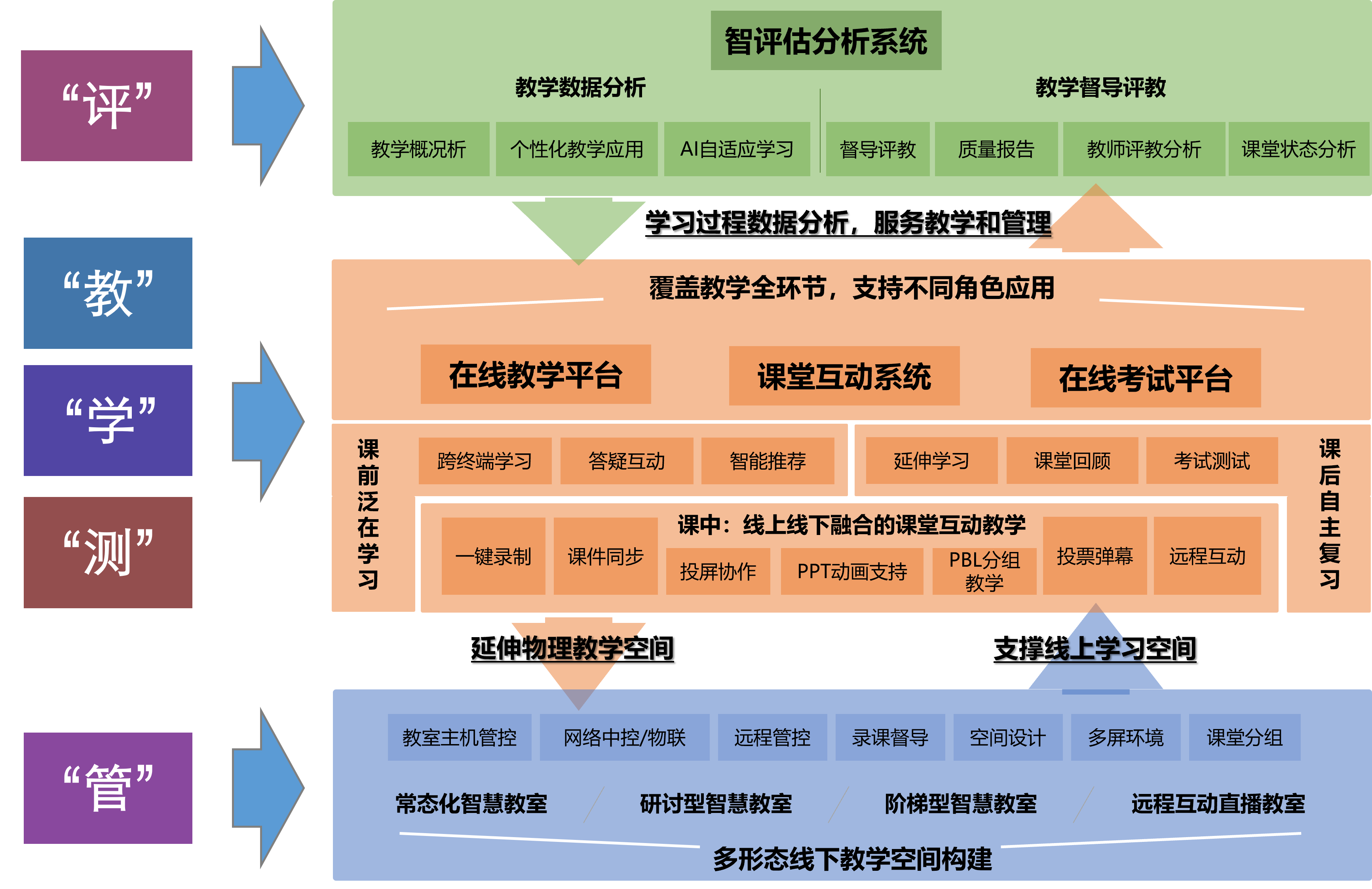 以服务教学为核心,应用互联网、人工智能、物联网、大数据等技术,提供软件层面包括:资源平台、在线学习平台、课堂互动平台、教学督导平台、教室管理平台、教师多维度评教、学生多元化评价等多个平台。