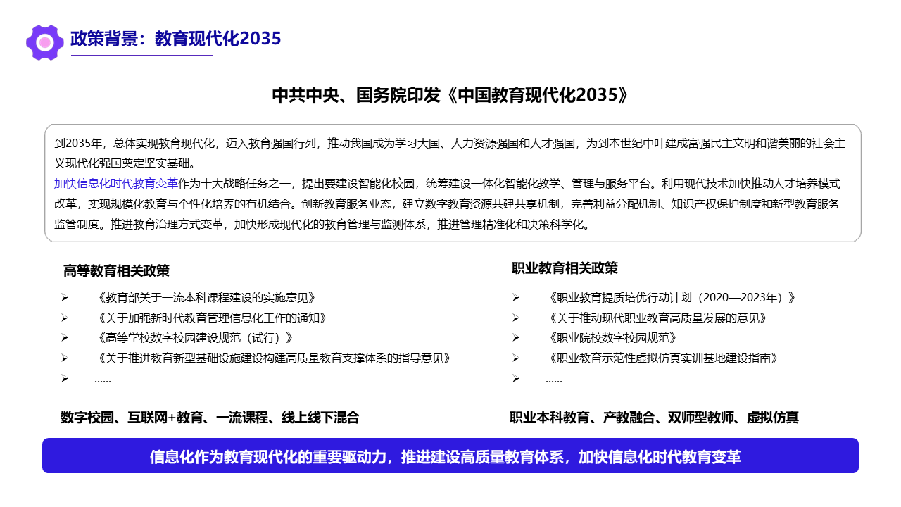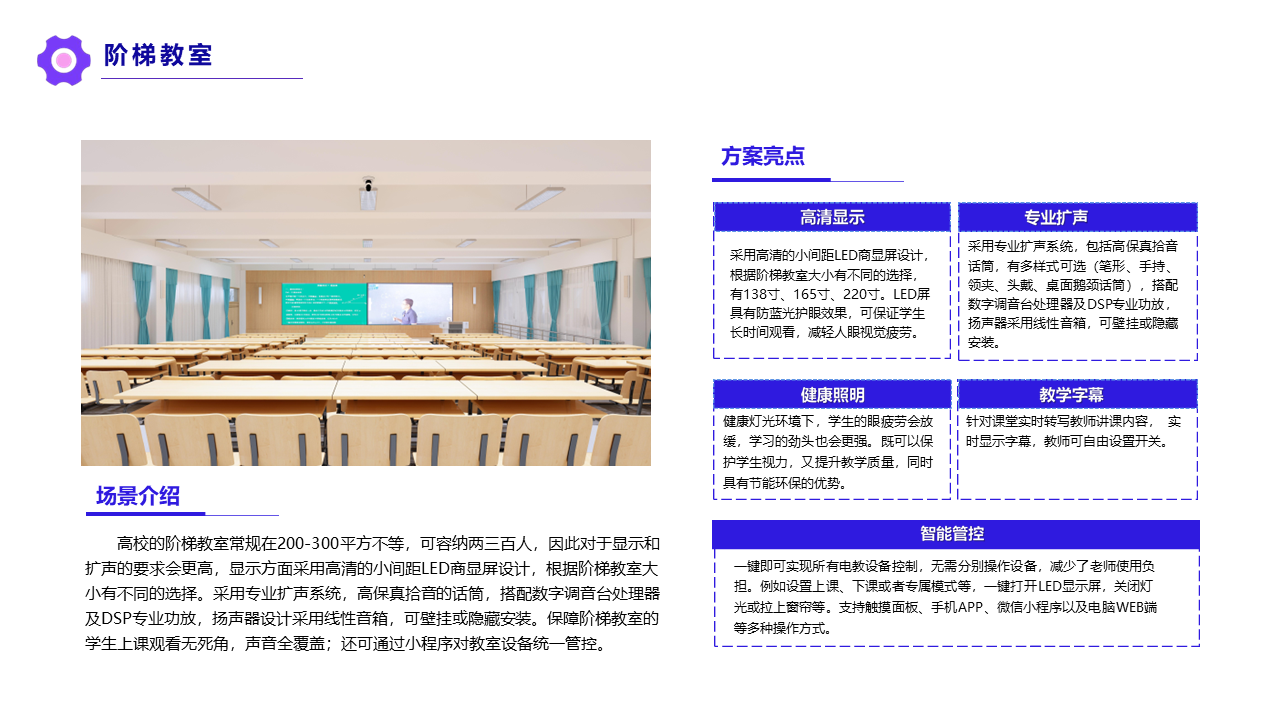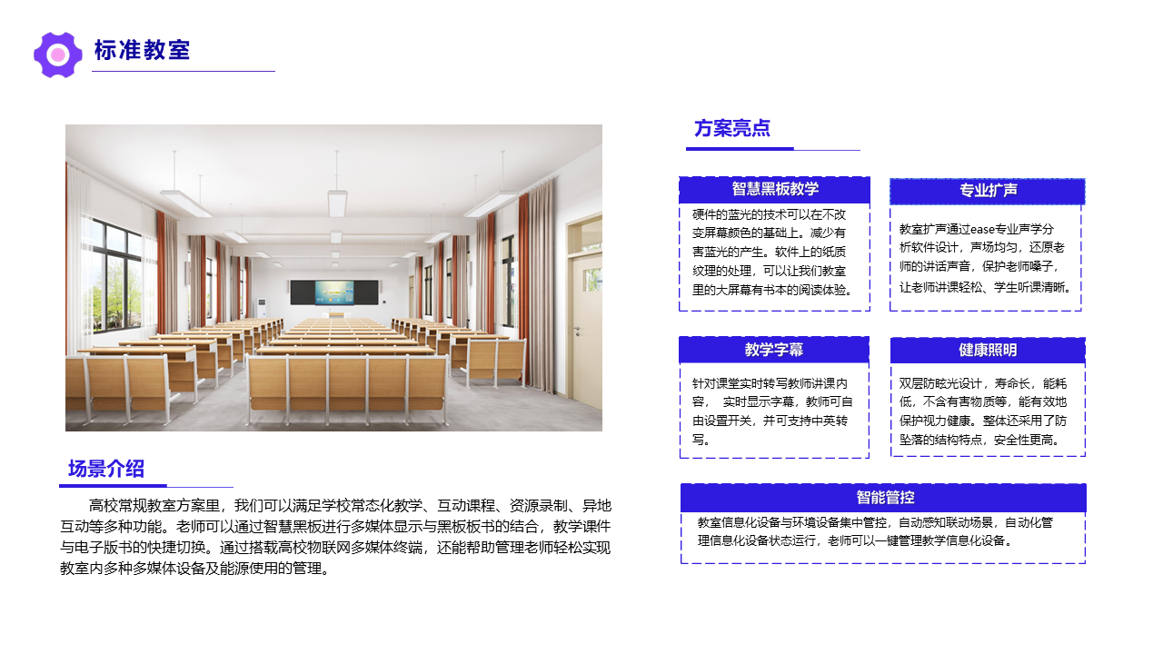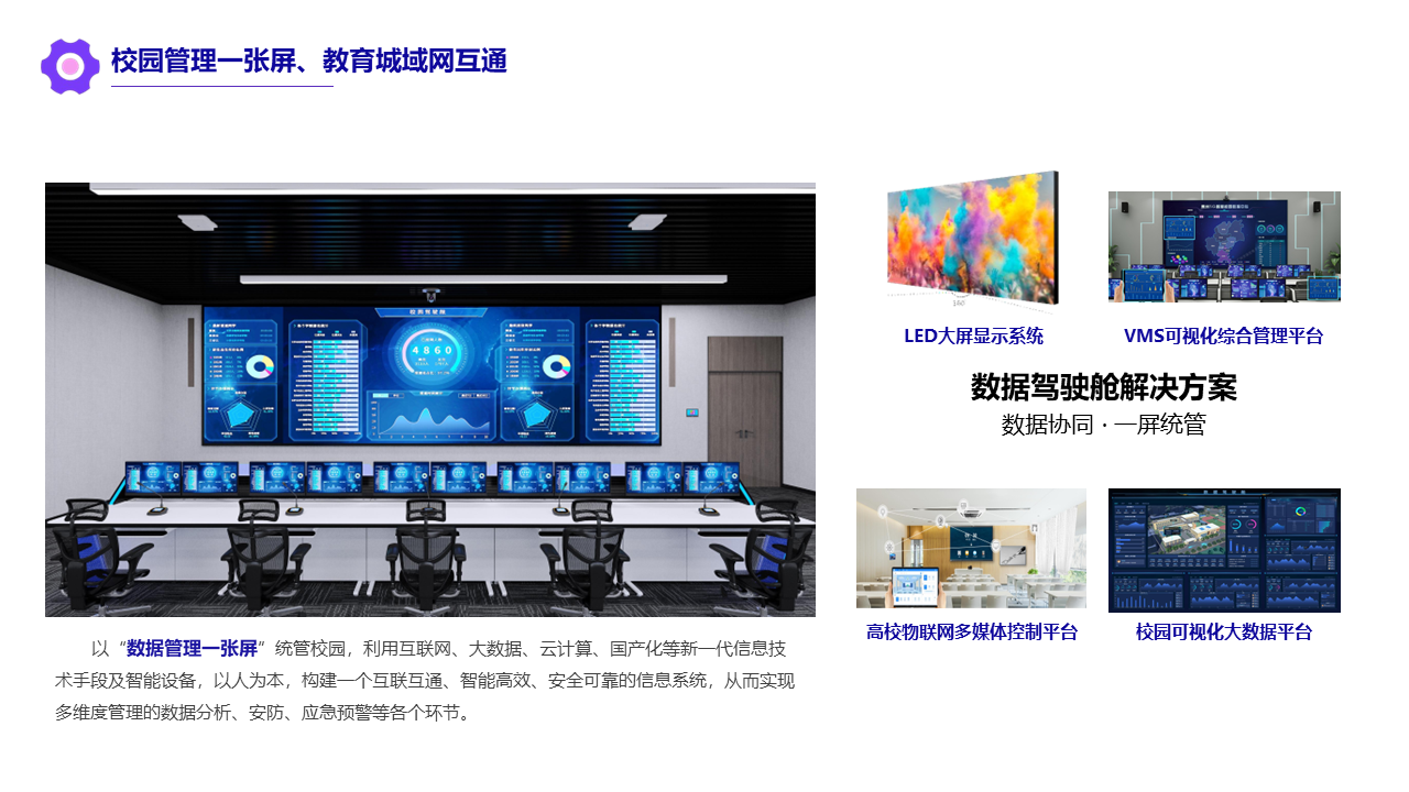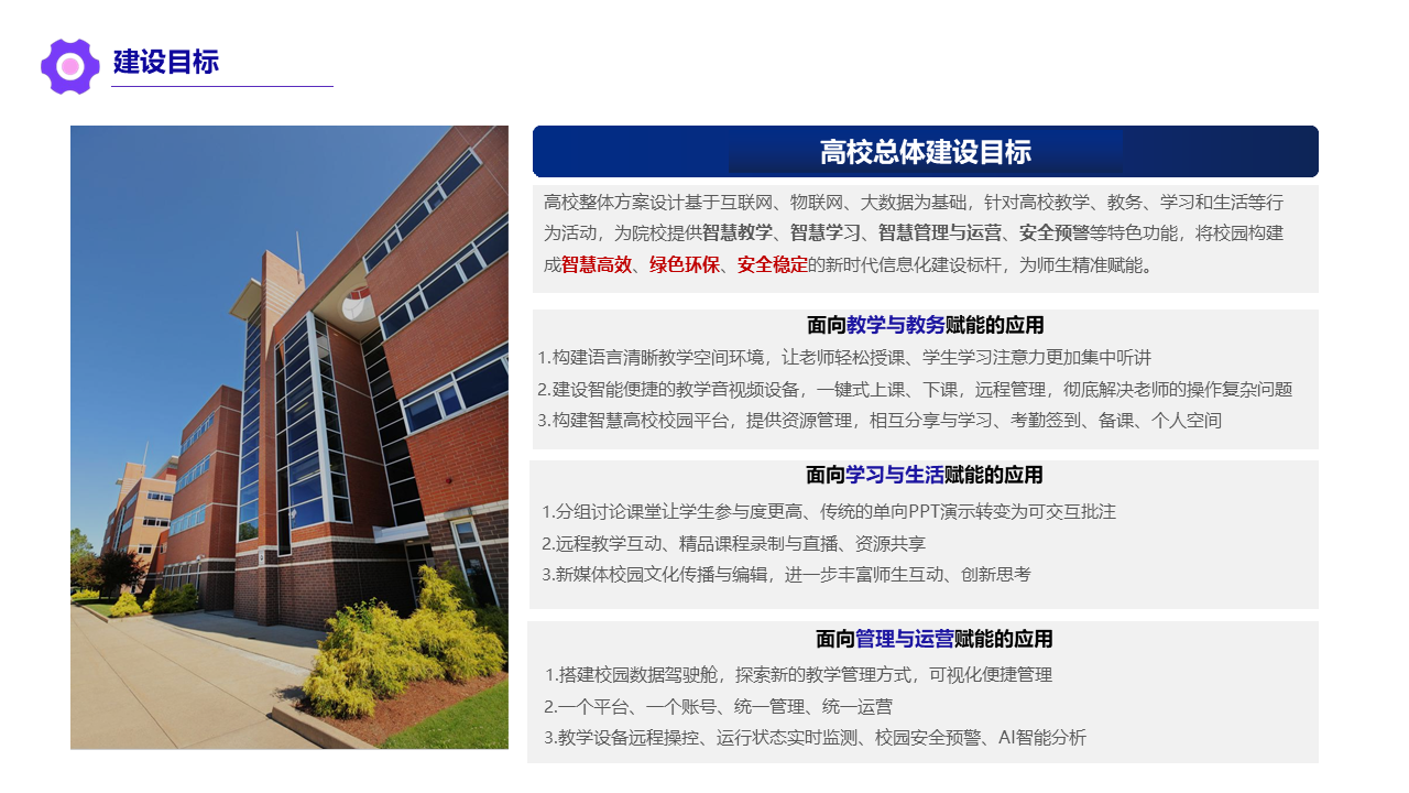 智慧高校综合解决方案是一种用于提高高校管理效率、服务水平、师生体验的技术方案。该方案通过智能化技术手段,实现校园信息化、数字化、智能化管理,包括智慧教学、智慧后勤、智慧校园安全等多个方面,可以有效地提高高校的管理水平、服务质量和师生的学习、工作、生活体验。