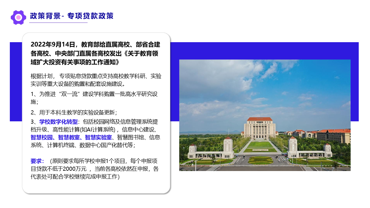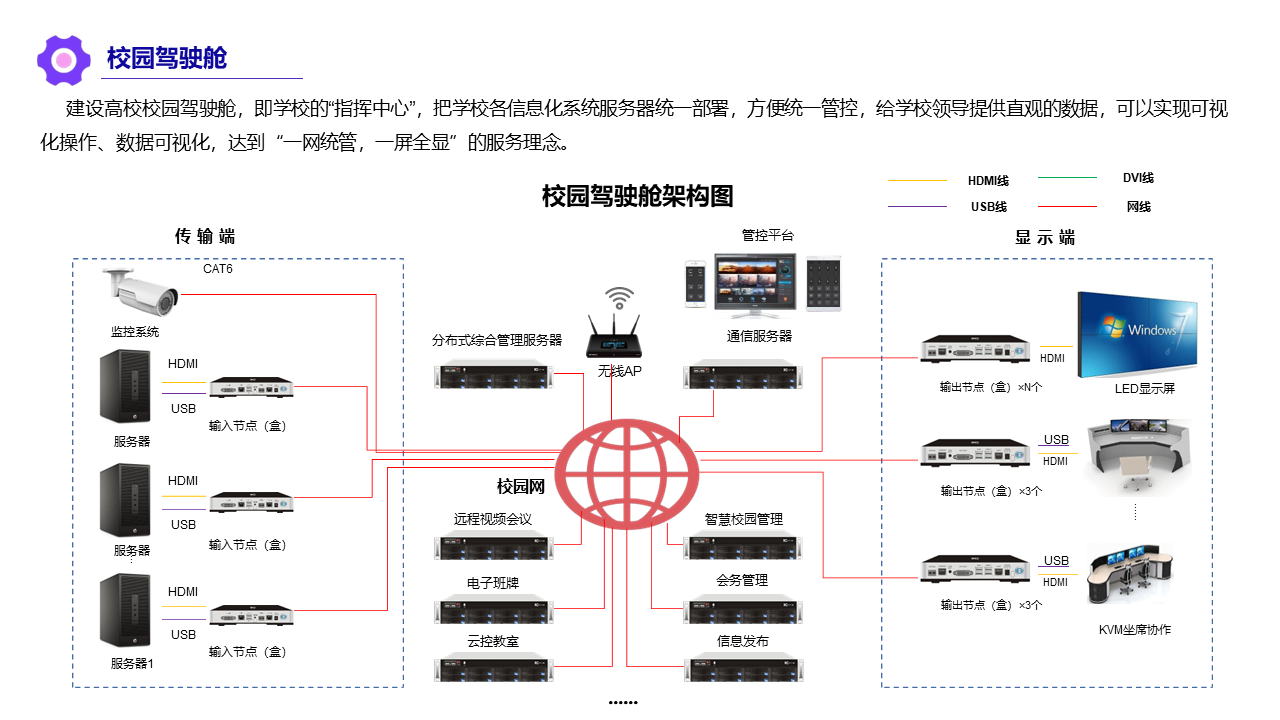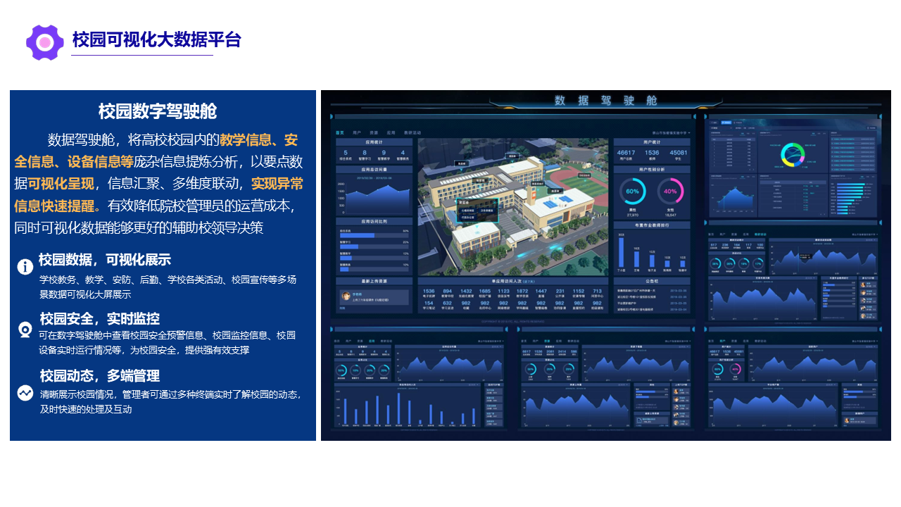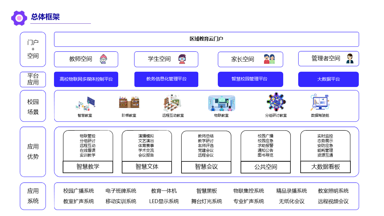 智慧高校综合解决方案通过云计算、大数据、物联网等技术手段,实现校园内各个业务系统的互联互通、信息共享、数据分析,从而提高学校的综合管理效率和服务水平,为师生创造更加便捷、高效、智能的校园环境。