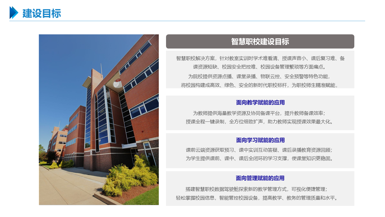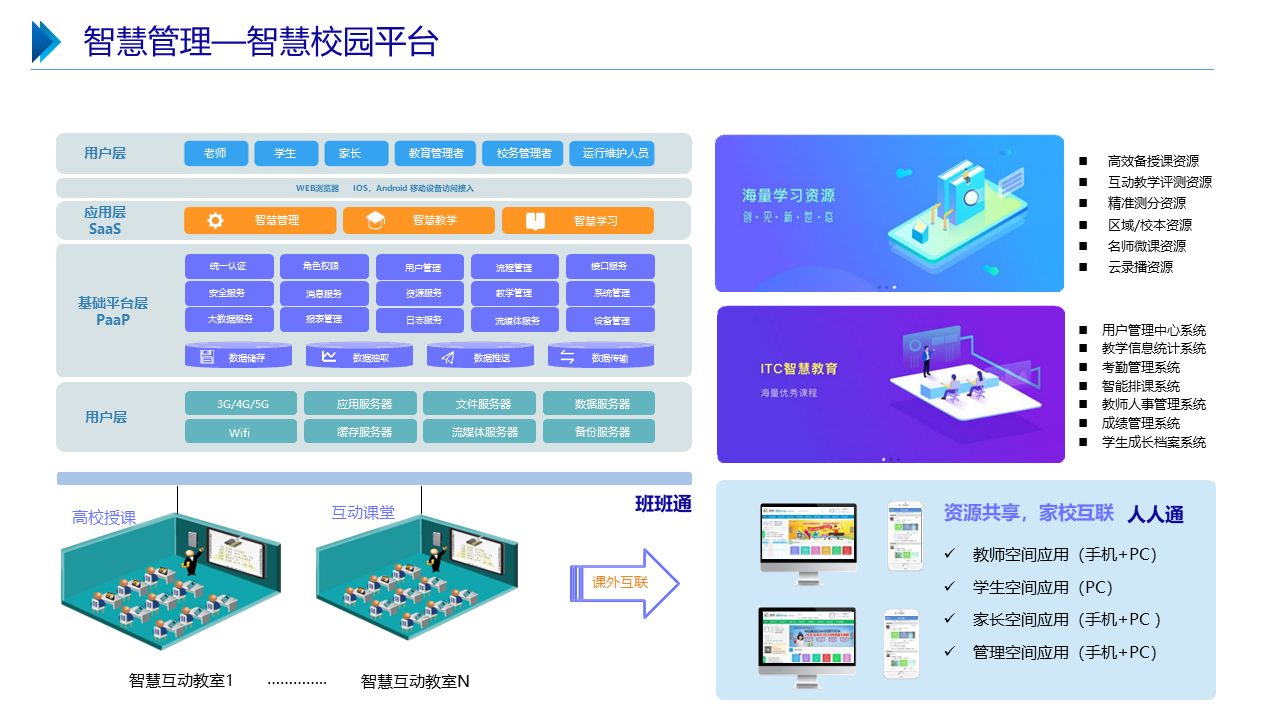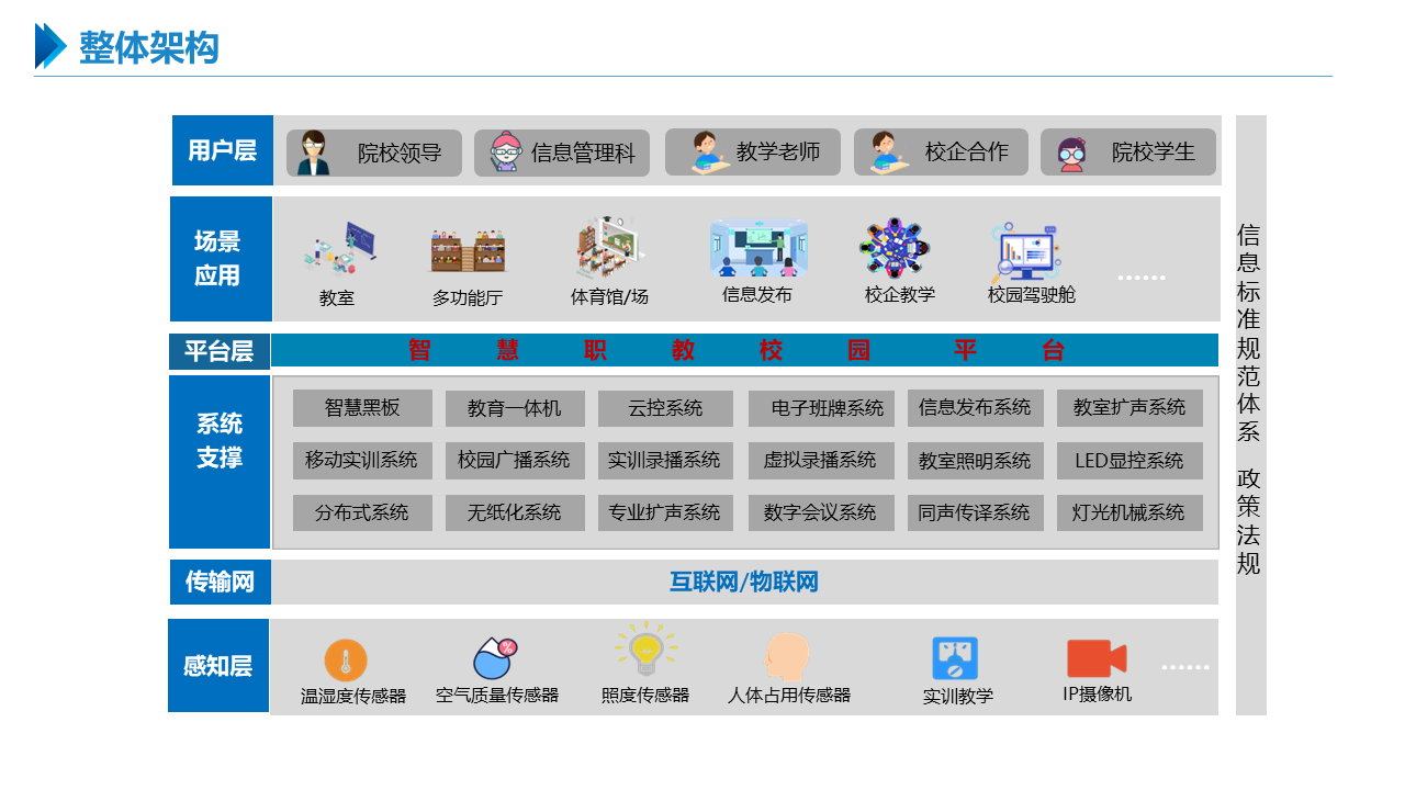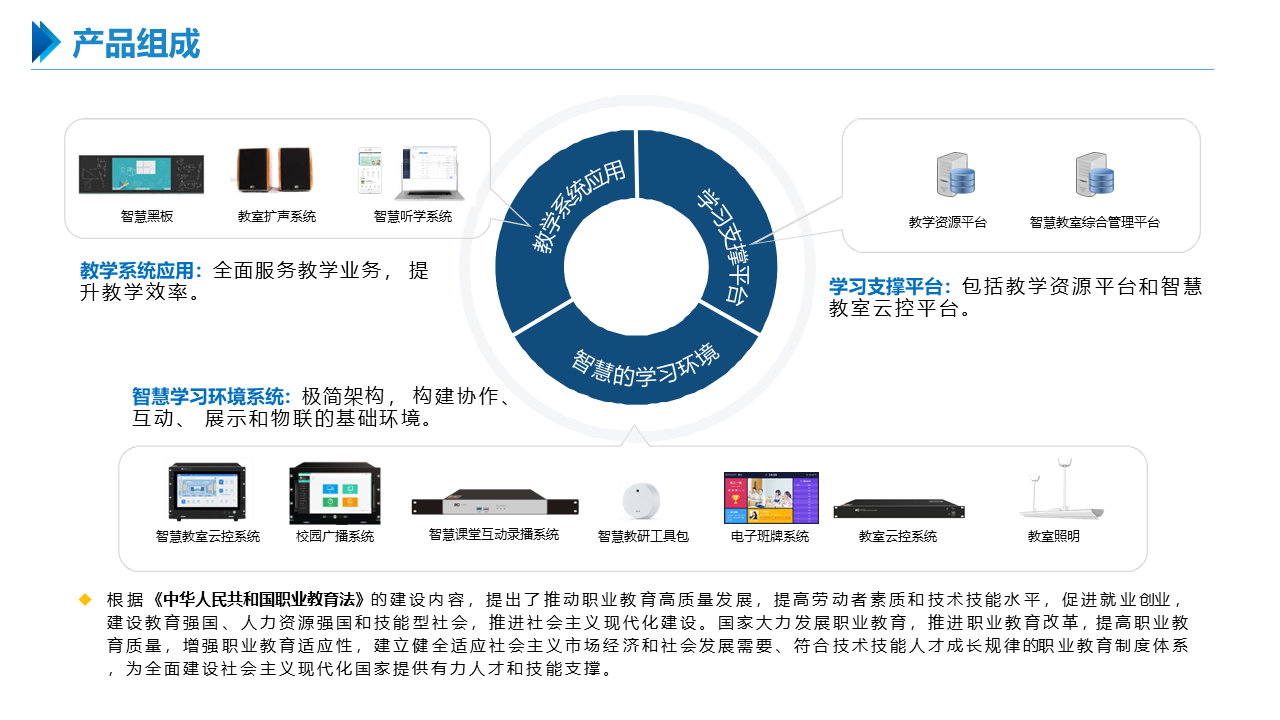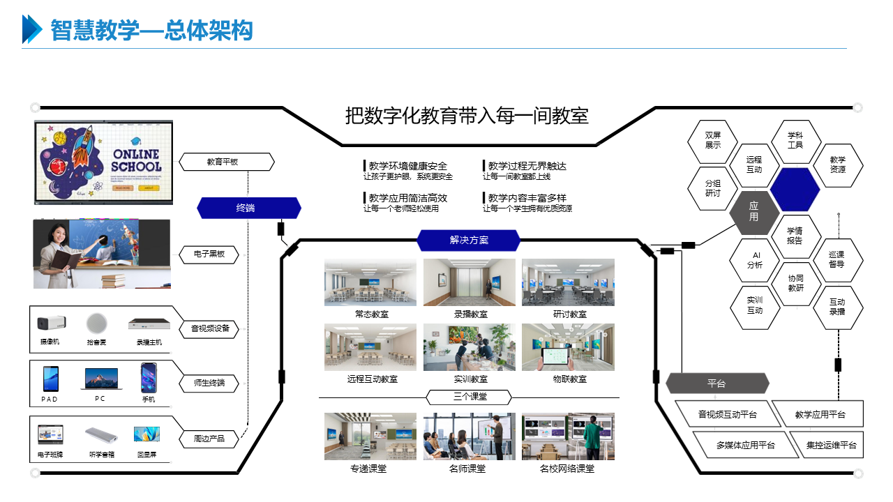 智慧职教解决方案包括建设智能化校园,统筹建设一体化智能化教学、管理与服务平台。利用现代技术加快推动人才培养模式改革,实现规模化教育与个性化培养的有机结合。