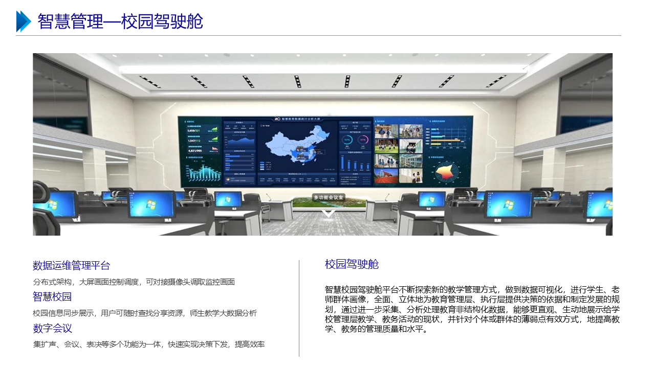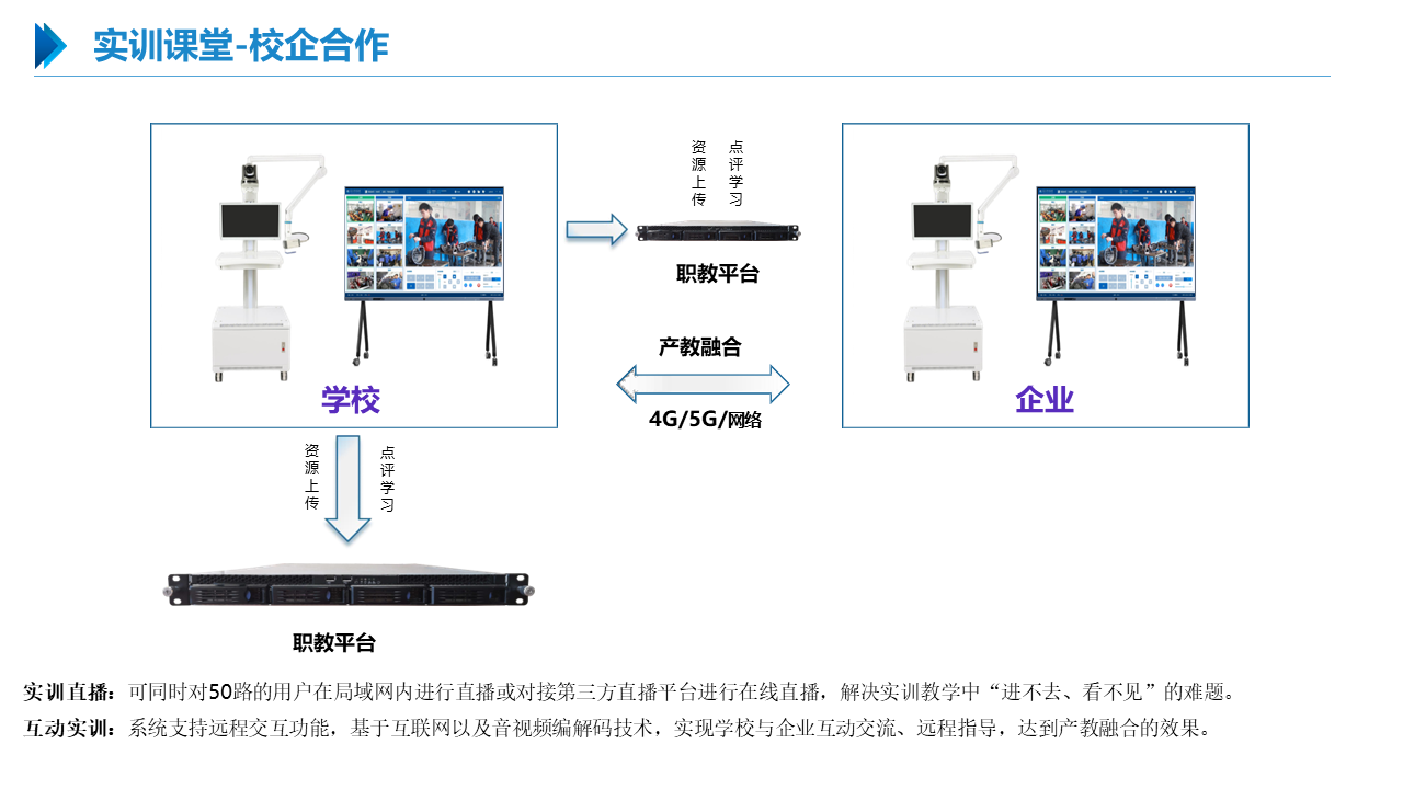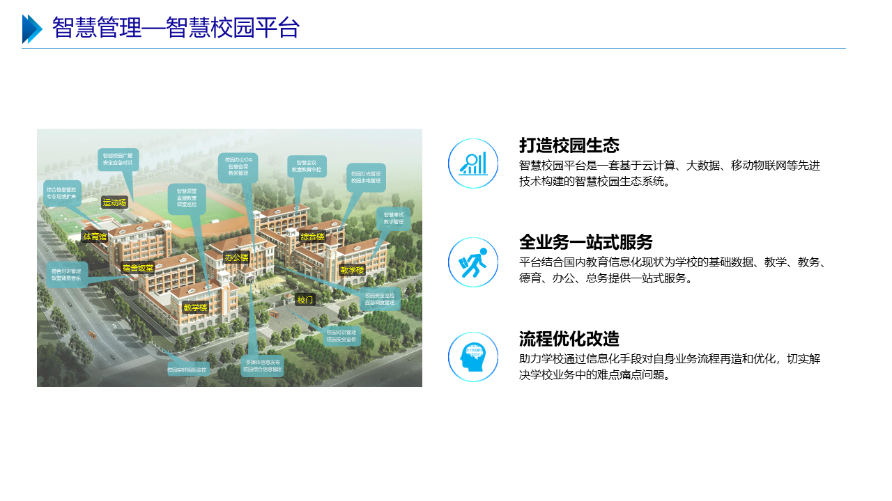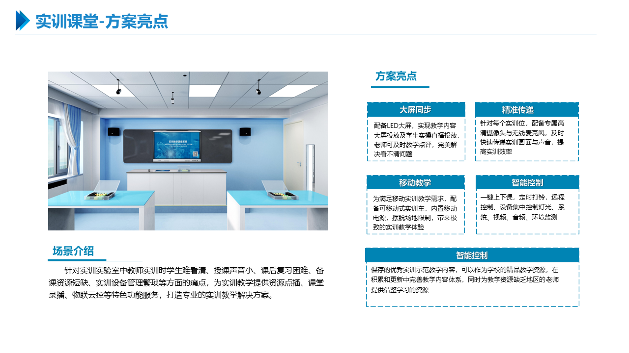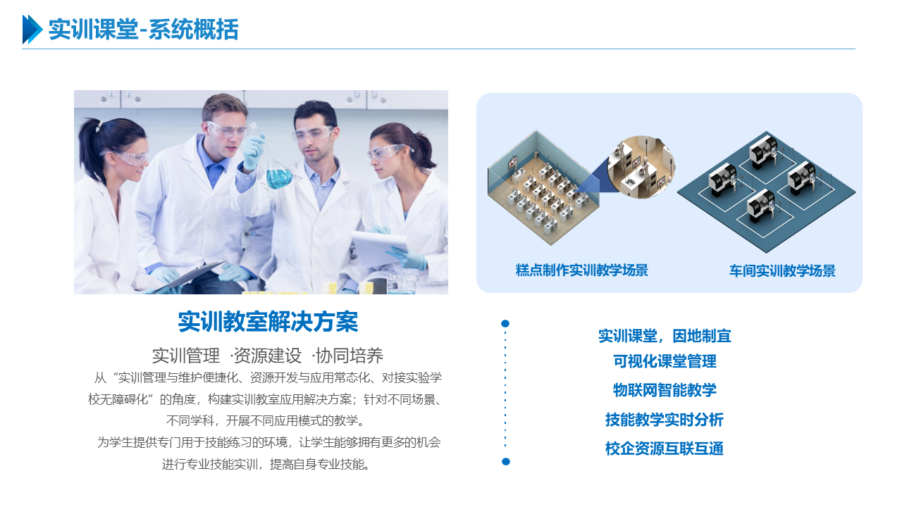 智慧职教解决方案包括建设智能化校园,统筹建设一体化智能化教学、管理与服务平台。利用现代技术加快推动人才培养模式改革,实现规模化教育与个性化培养的有机结合。