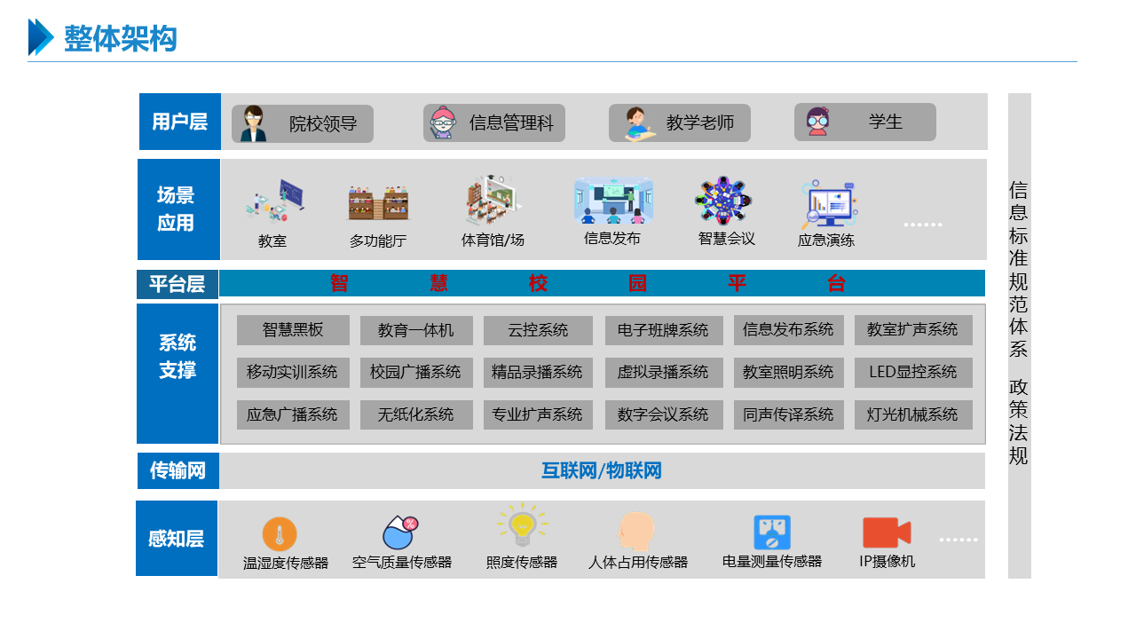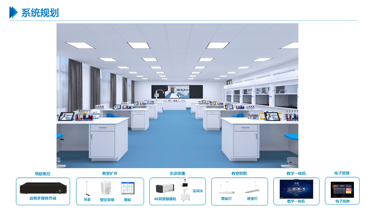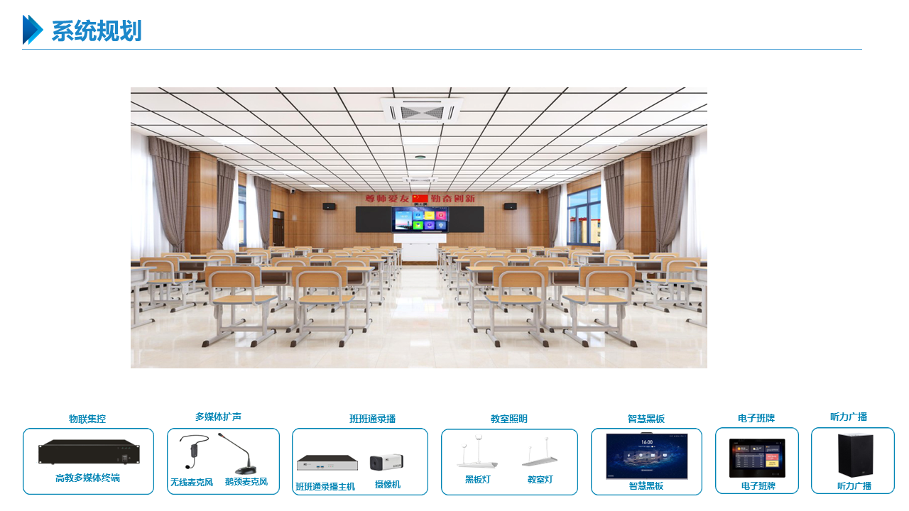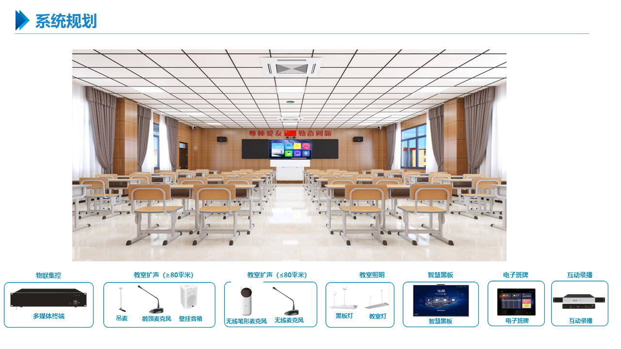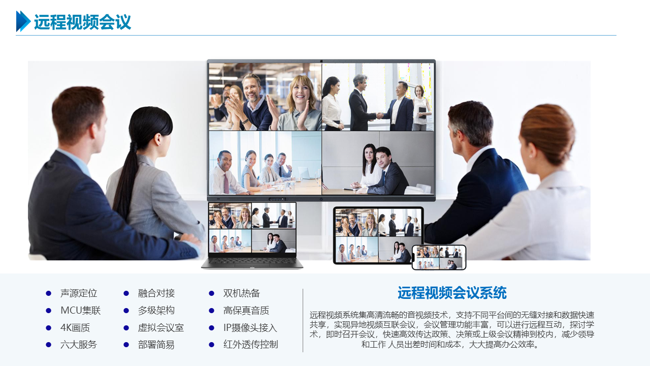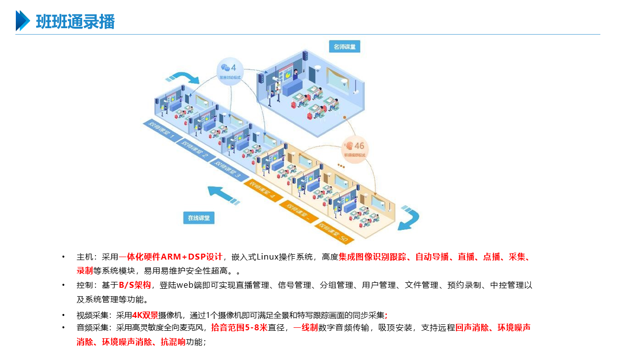 中学音视频系统解决方案采用云网一体化的模式,构建“云平台+网+端+内容+应用"五位一体的产品形态。运用5G、云计算、大数据、人工智能等先进技术,以智慧课堂和互动敦学为核心,形成以学生为主体的教育生态圈,实现信息技术与教学应用的深度融合。