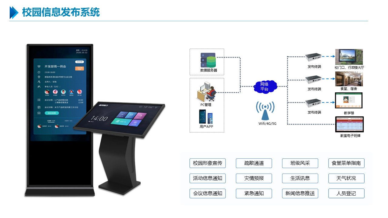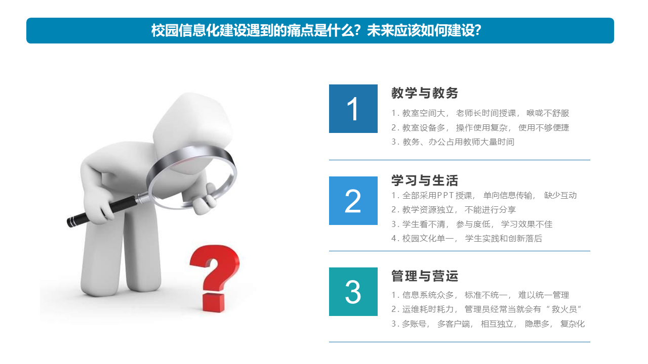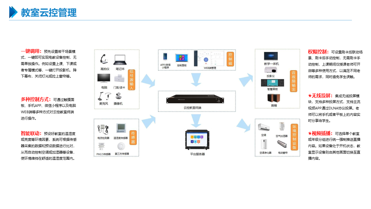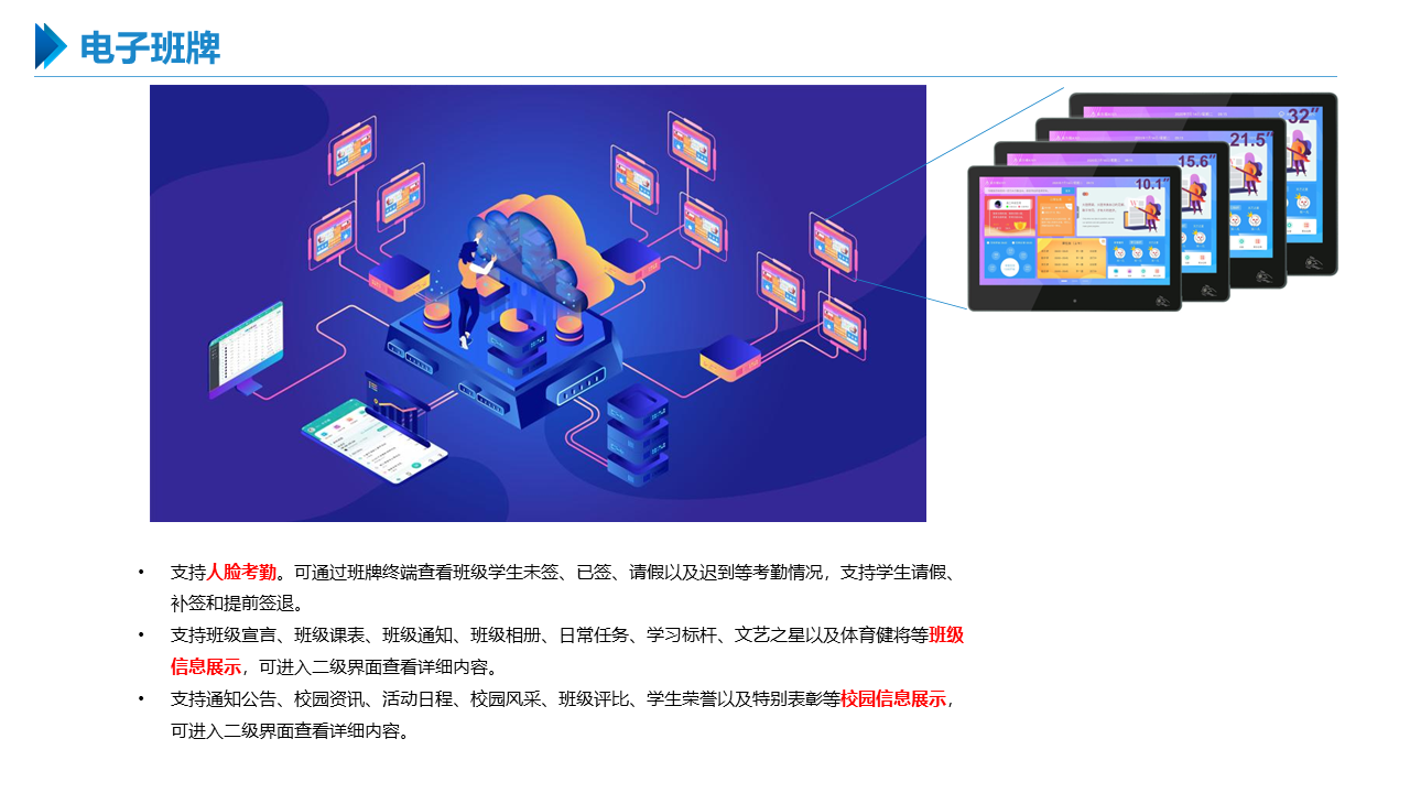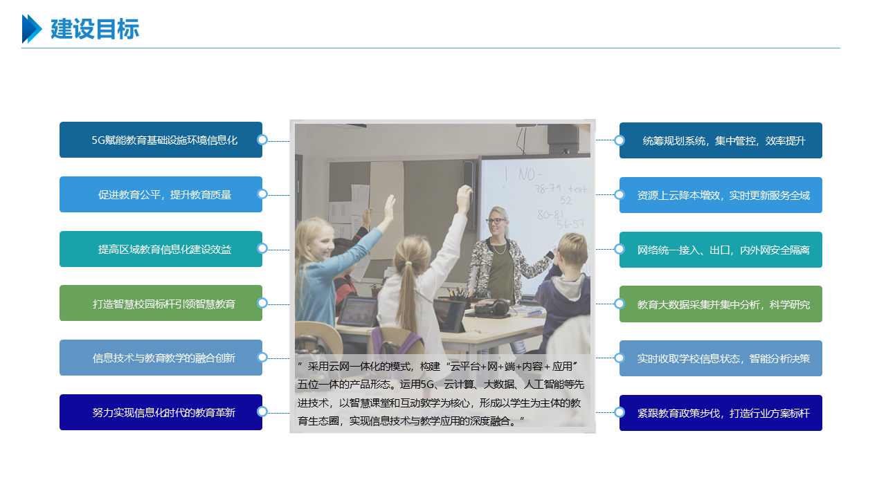 采用云网一体化的模式,构建“云平台+网+端+内容+应用"五位一体的产品形态。运用5G、云计算、大数据、人工智能等先进技术,以智慧课堂和互动敦学为核心,形成以学生为主体的教育生态圈,实现信息技术与教学应用的深度融合。