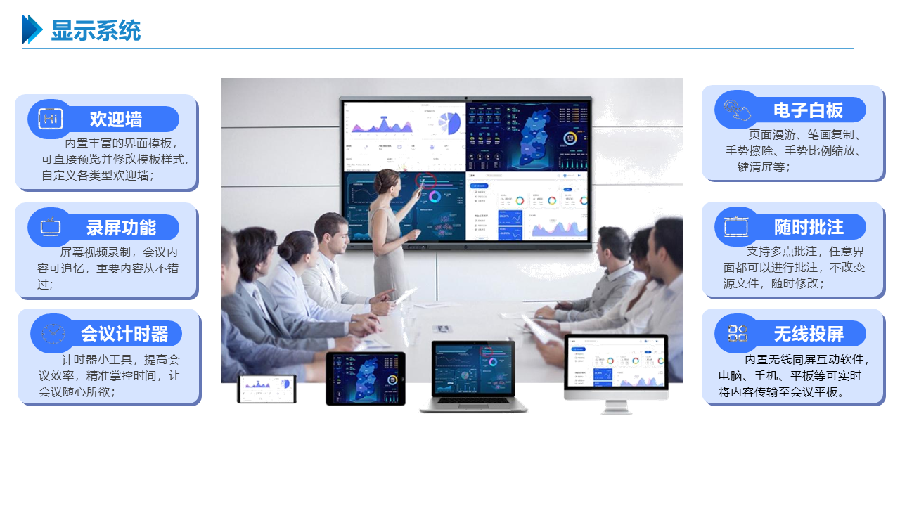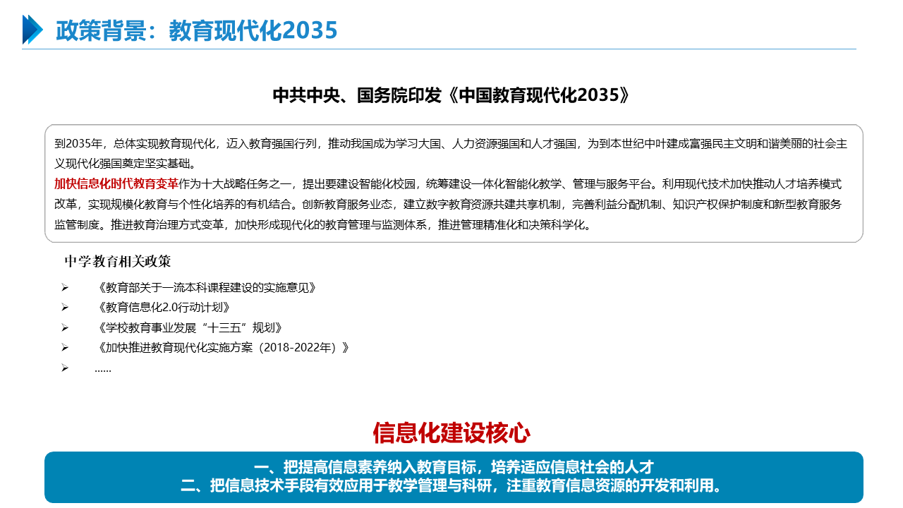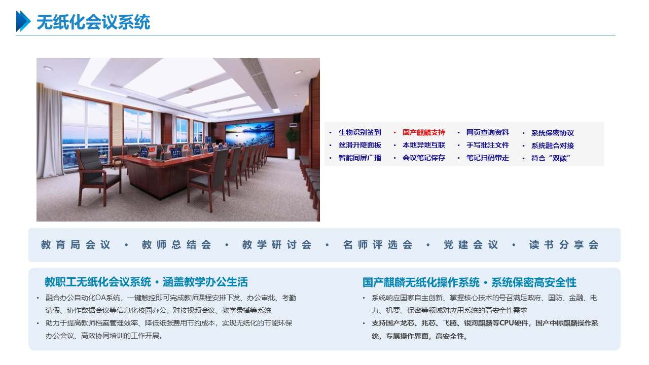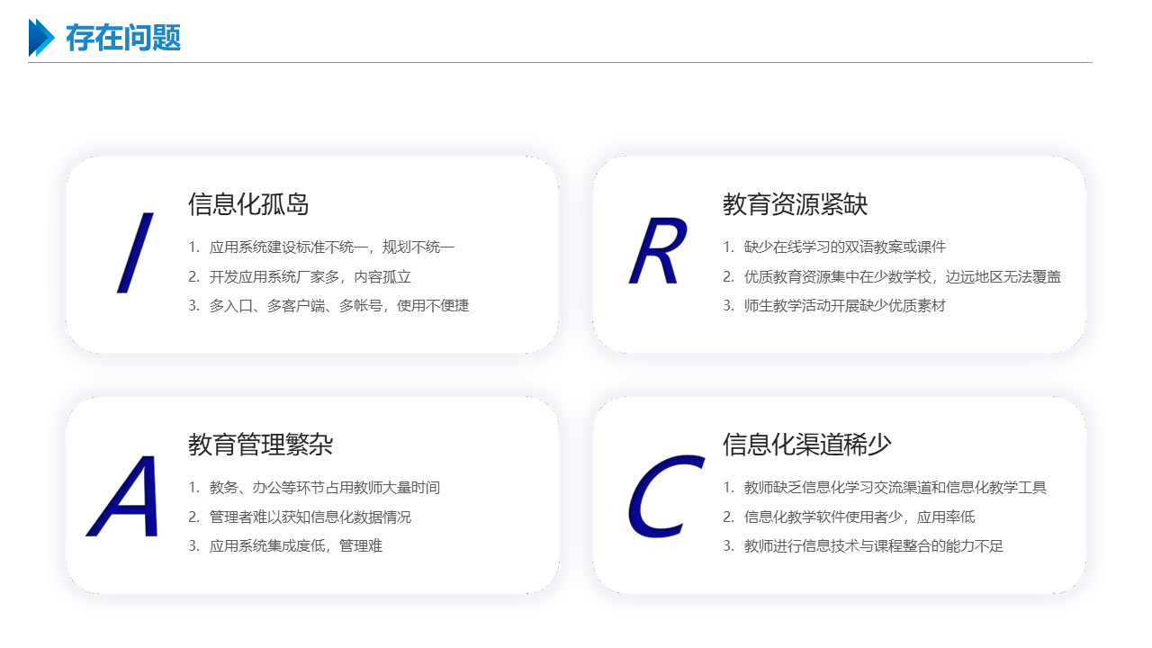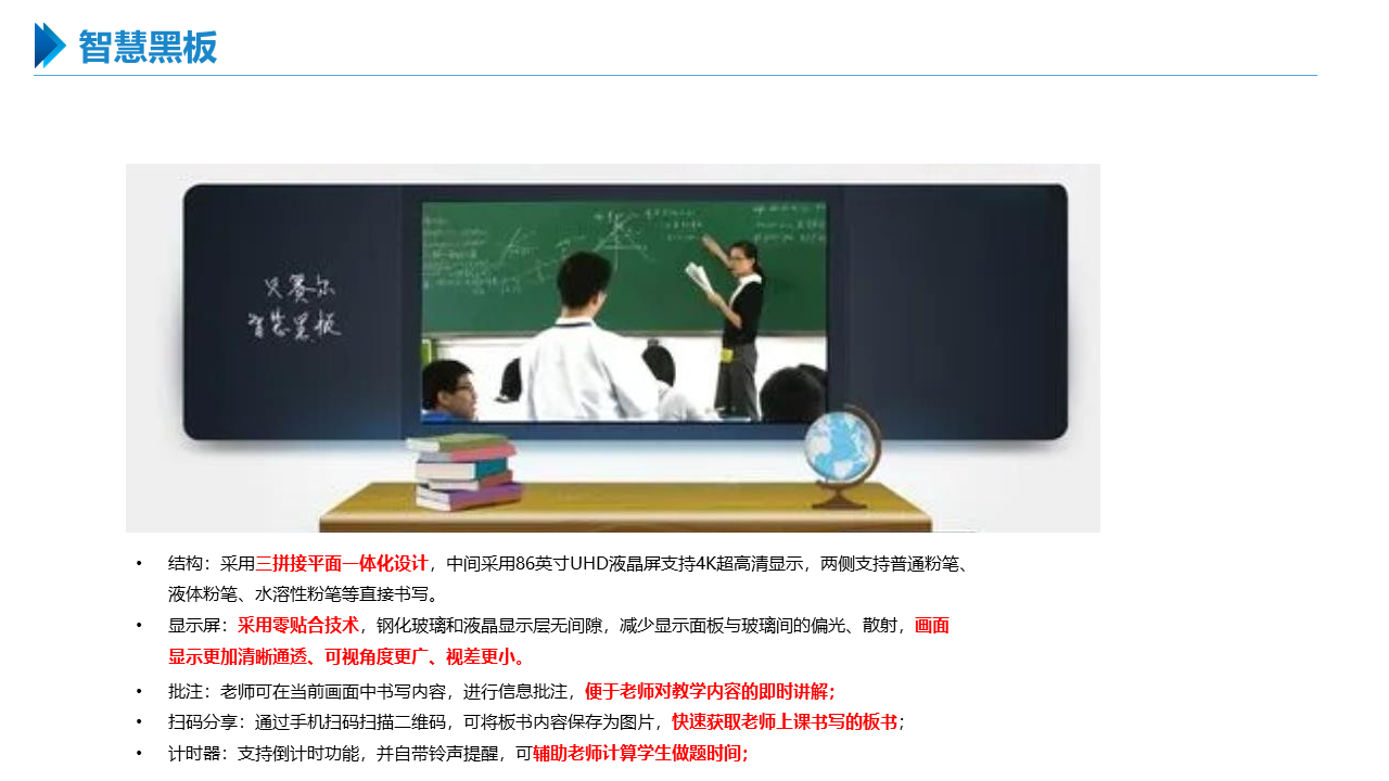 采用云网一体化的模式,构建“云平台+网+端+内容+应用"五位一体的产品形态。运用5G、云计算、大数据、人工智能等先进技术,以智慧课堂和互动敦学为核心,形成以学生为主体的教育生态圈,实现信息技术与教学应用的深度融合。