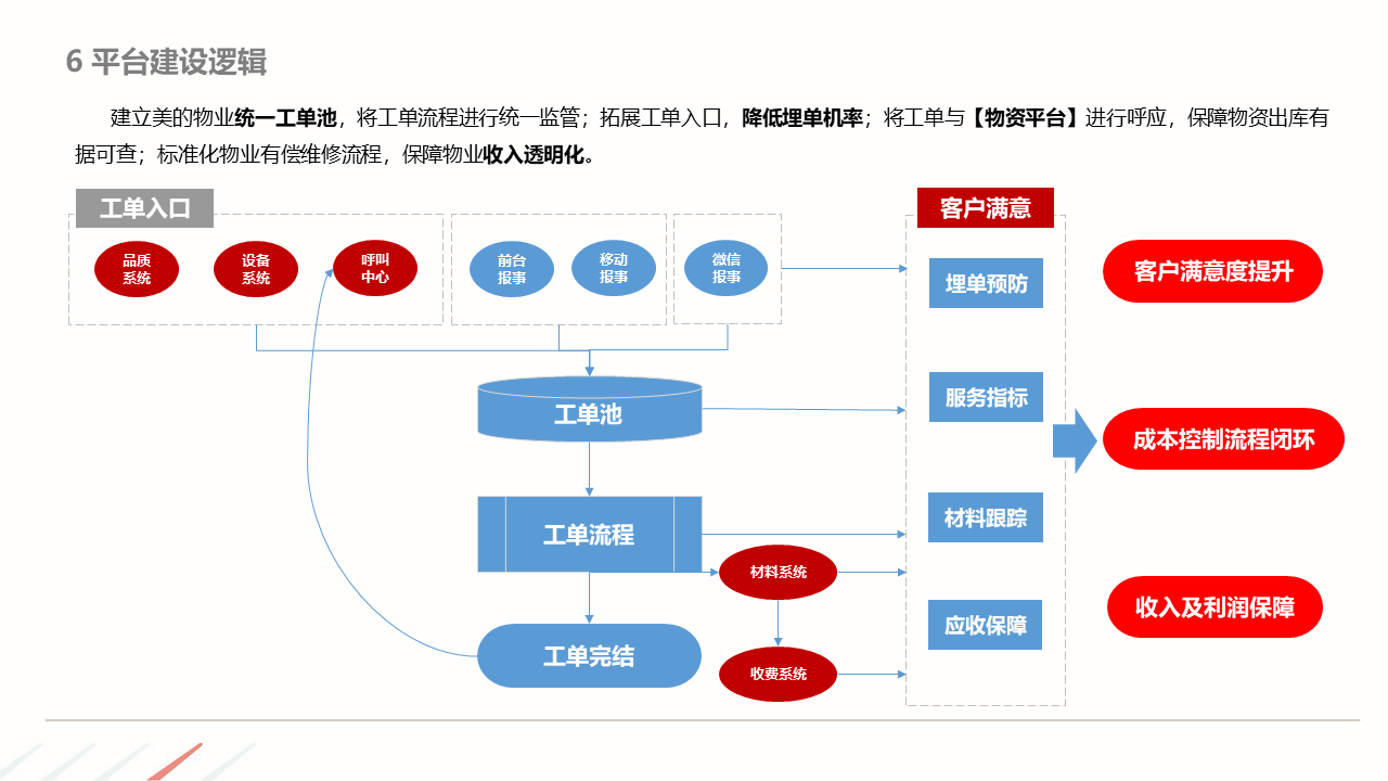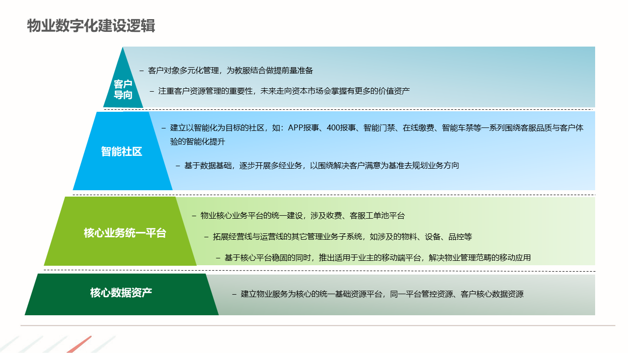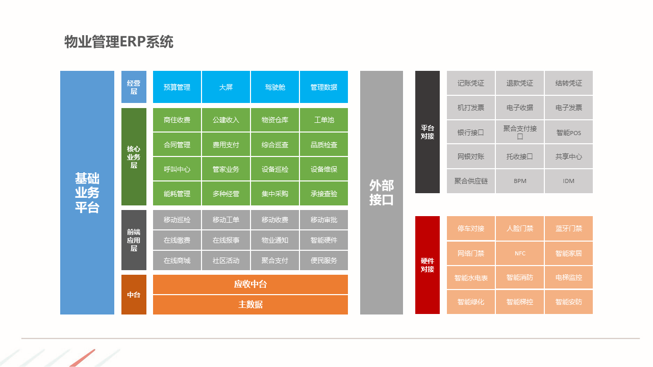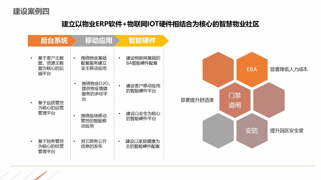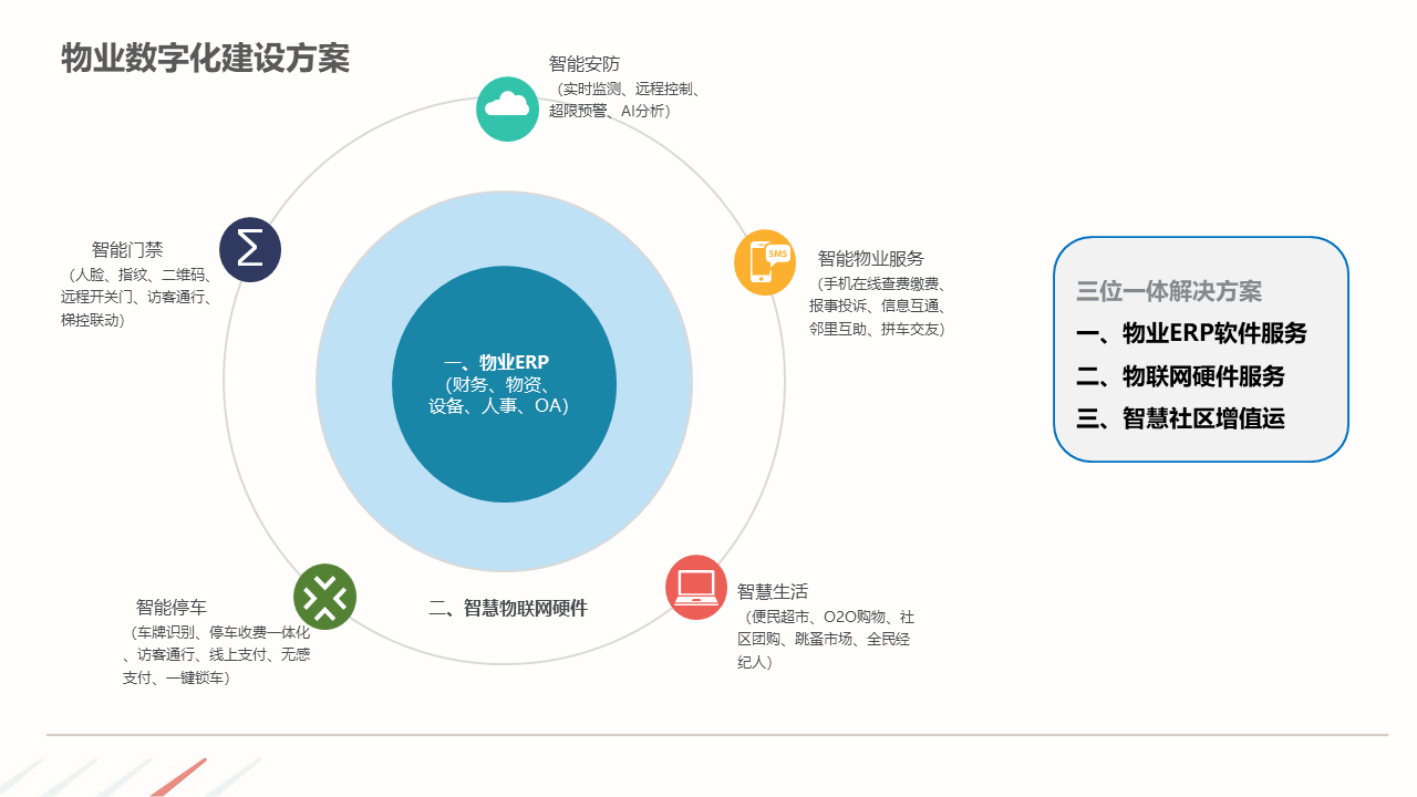 物业ERP系统一体化建设方案建立以智能化为目标的社区, 如:APP报事、400报事、智能门禁、在线缴费、智能车禁等一系列围绕客服品质与客户体验的智能化提升,基于数据基础,逐步开展多经业务,以围绕解决客户满意为基准去规划业务方向。