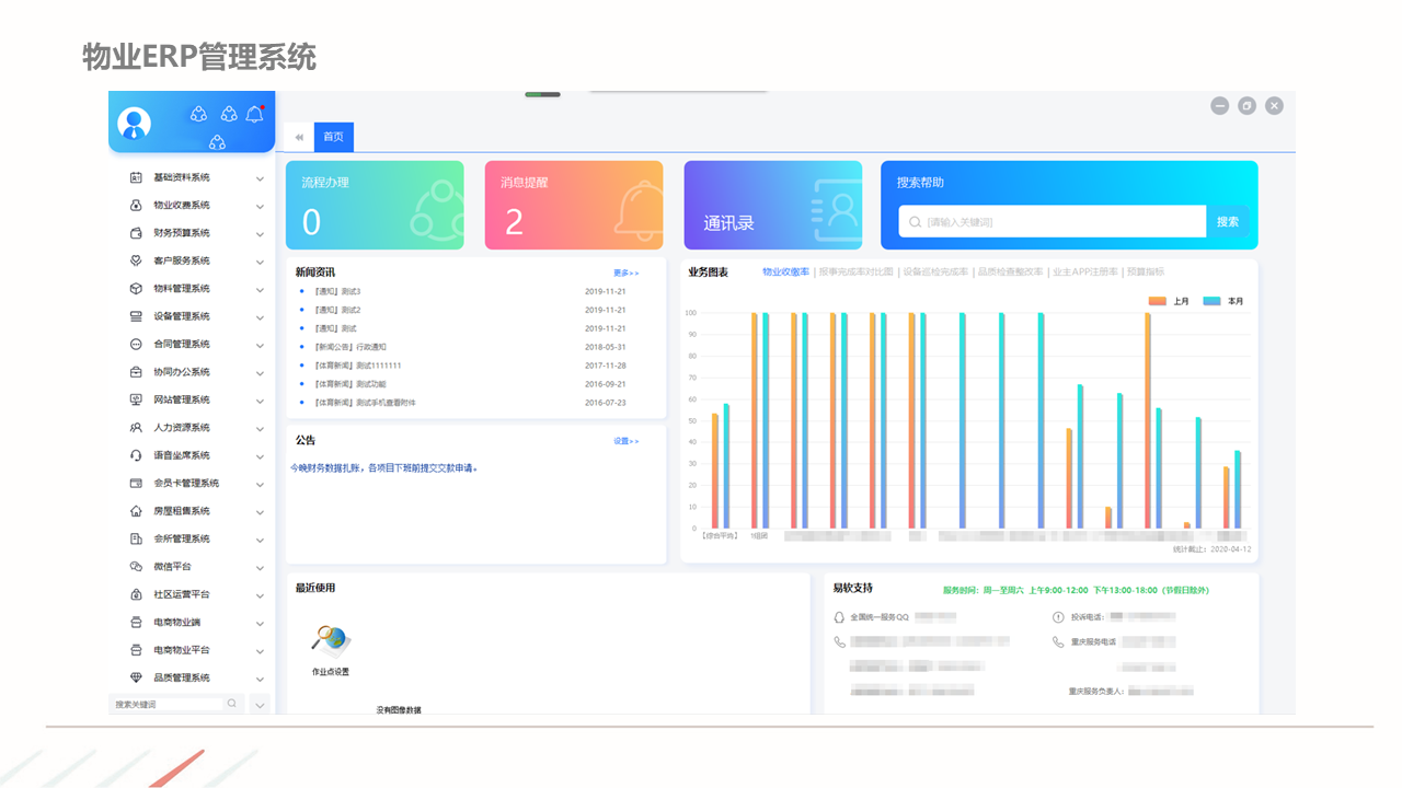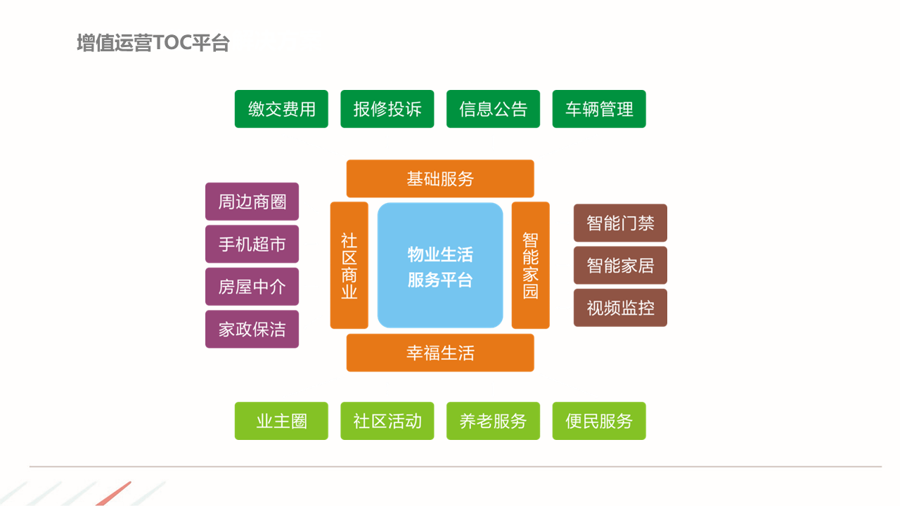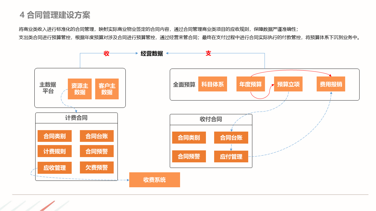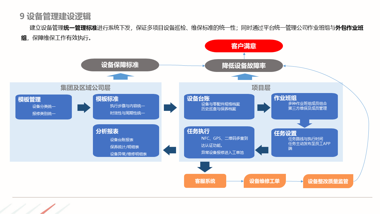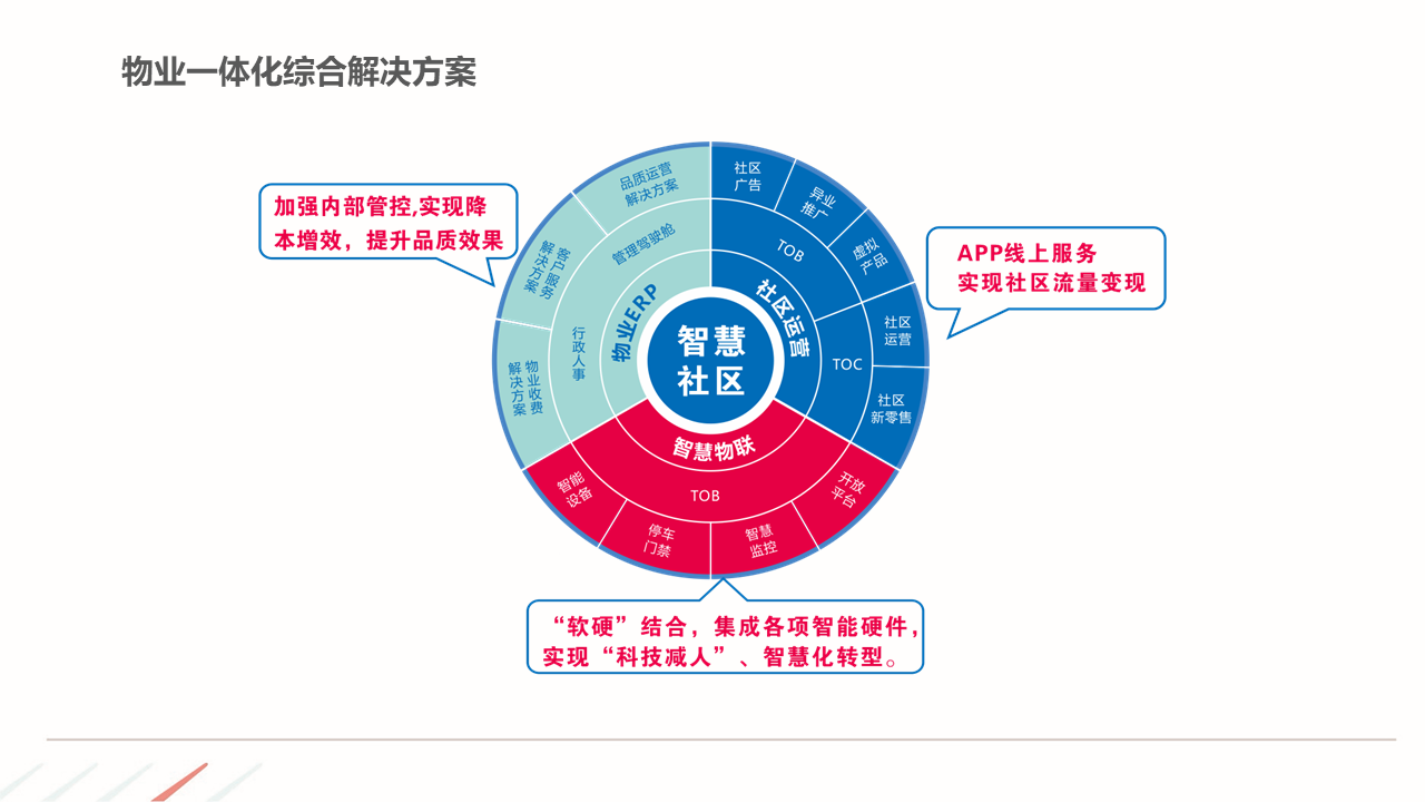 物业ERP系统一体化建设方案建立以智能化为目标的社区, 如:APP报事、400报事、智能门禁、在线缴费、智能车禁等一系列围绕客服品质与客户体验的智能化提升,基于数据基础,逐步开展多经业务,以围绕解决客户满意为基准去规划业务方向。