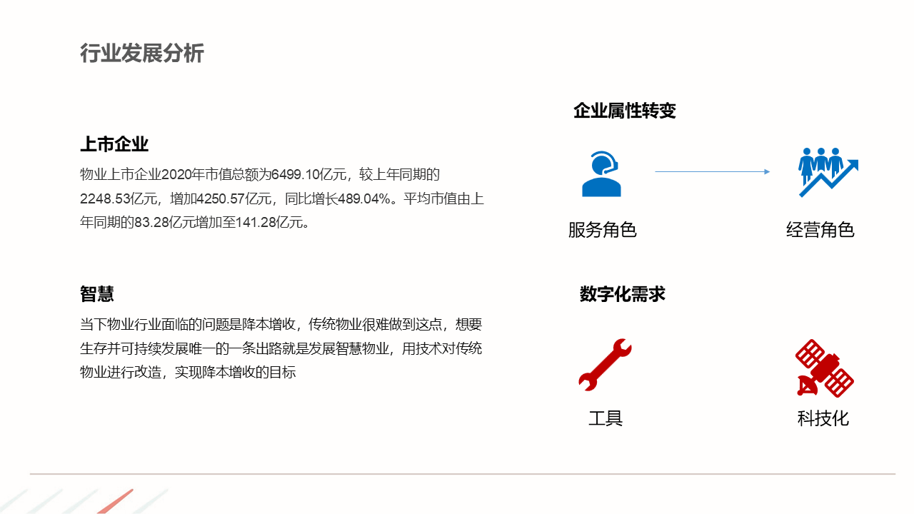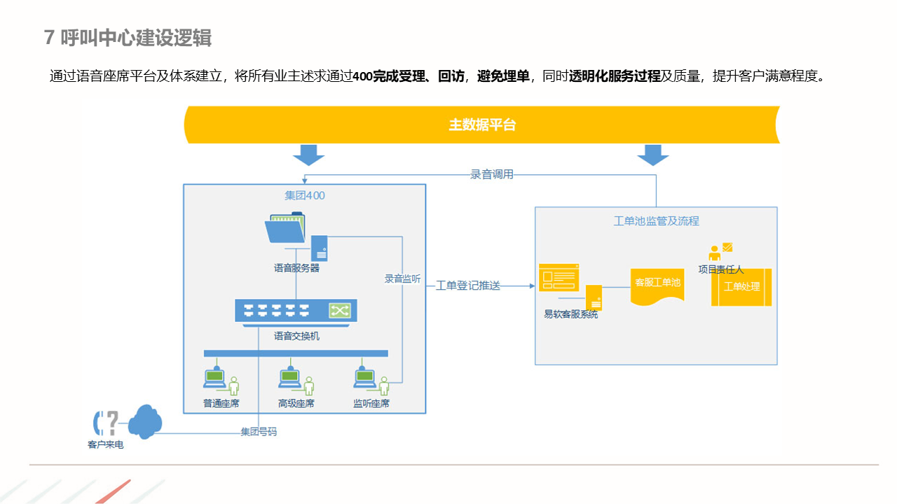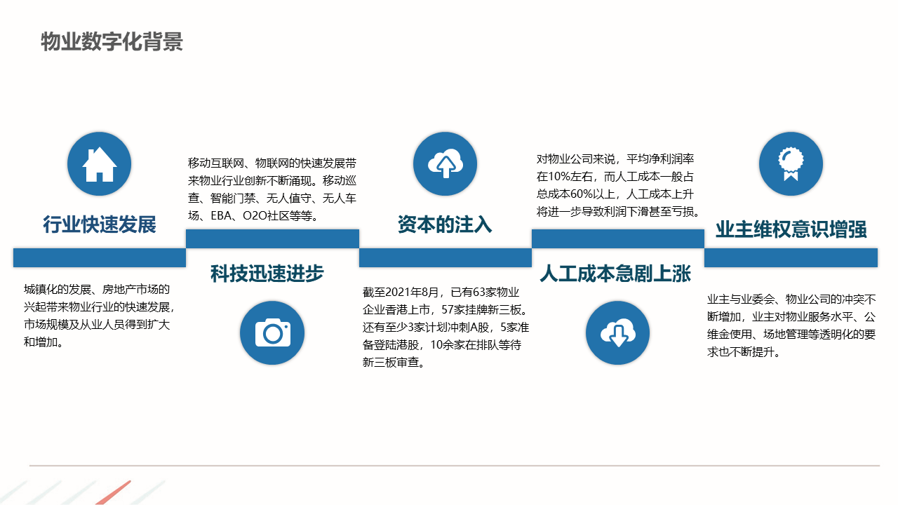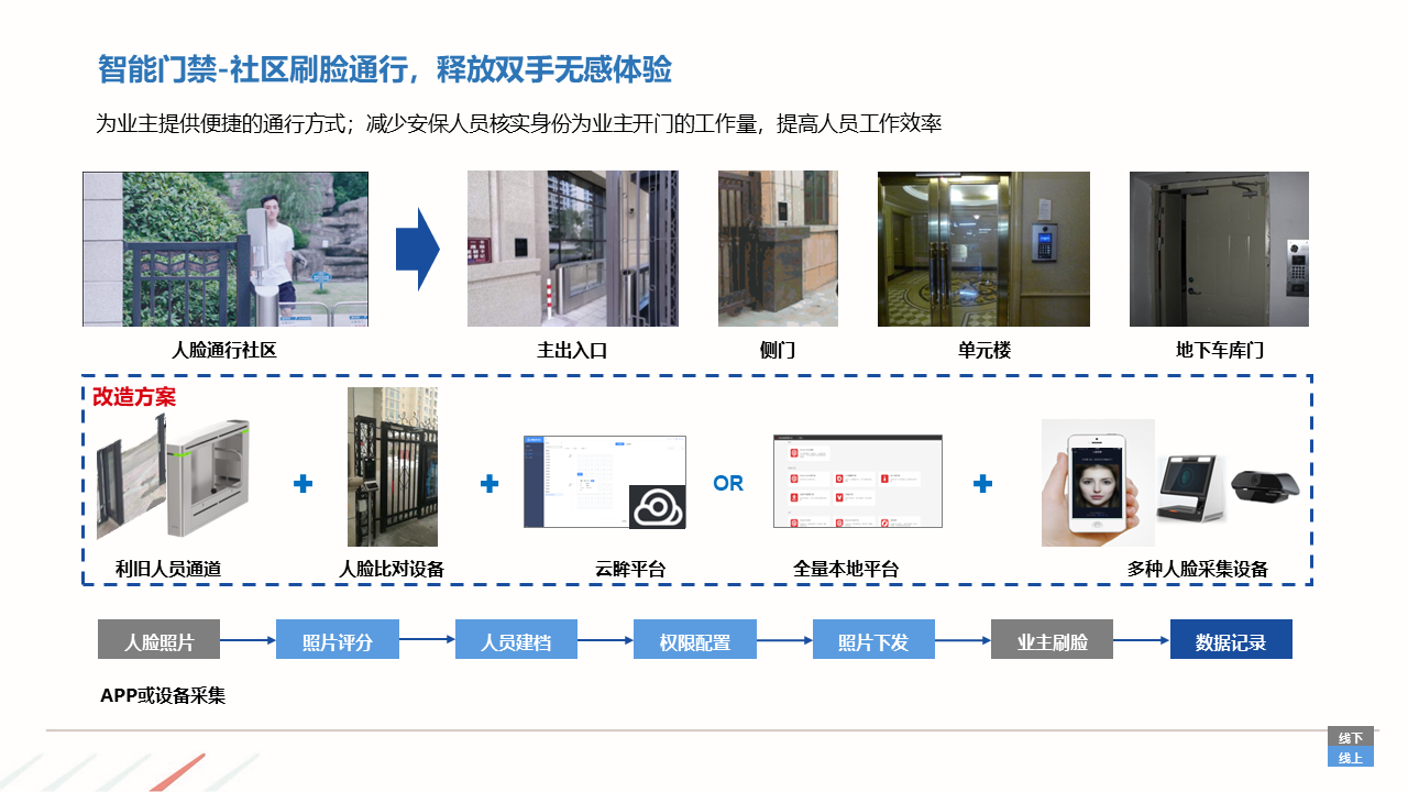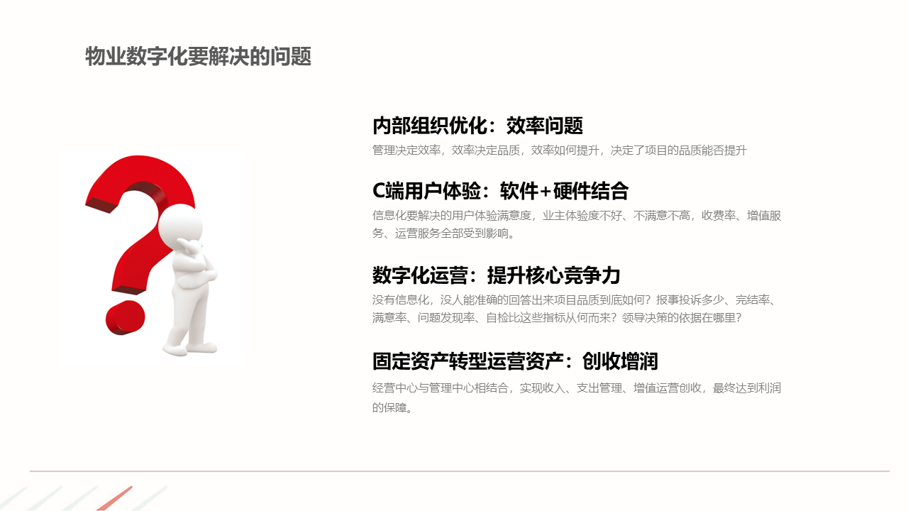 物业ERP系统一体化建设方案建立以智能化为目标的社区, 如:APP报事、400报事、智能门禁、在线缴费、智能车禁等一系列围绕客服品质与客户体验的智能化提升,基于数据基础,逐步开展多经业务,以围绕解决客户满意为基准去规划业务方向。