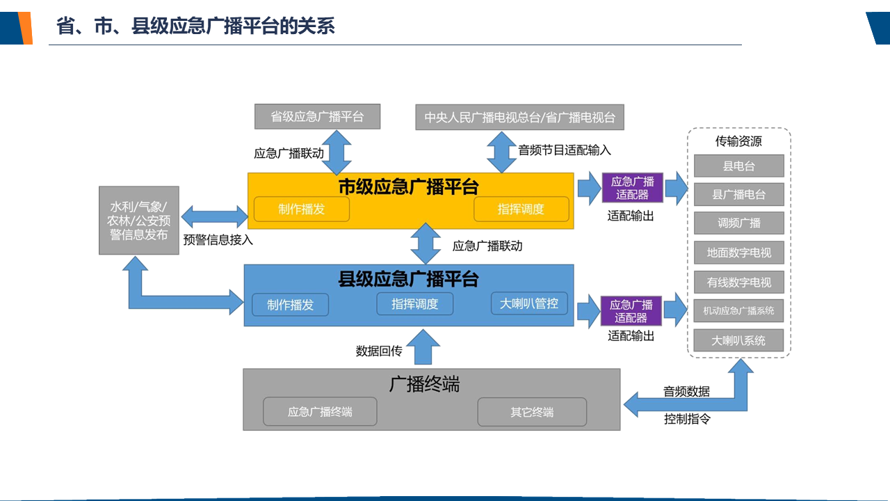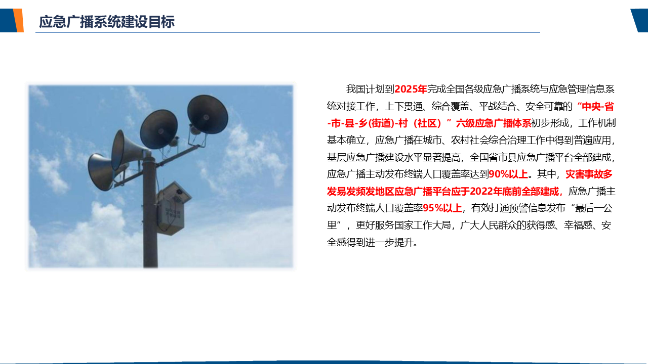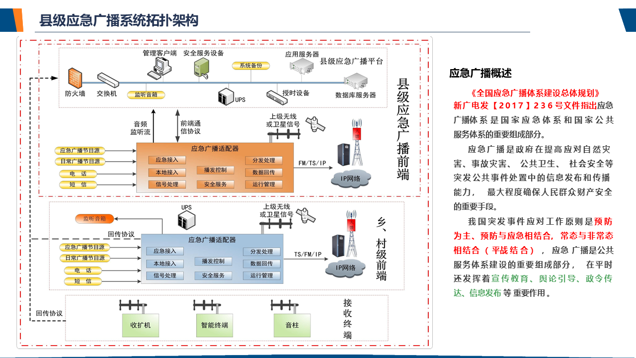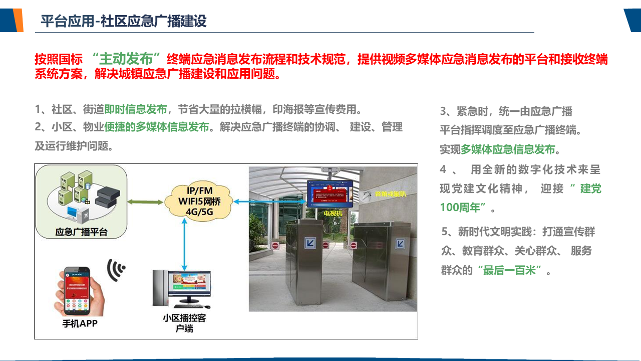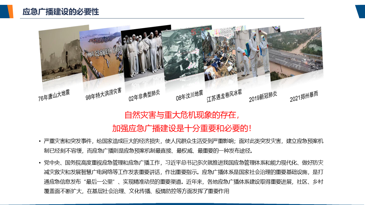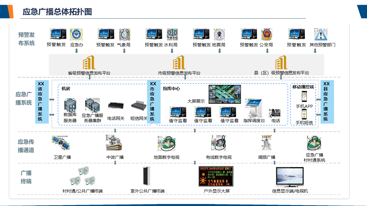 了解应急广播应急广播是一个应急信息发布系统。应急广播是利用广播电视和新媒体等方式,通过广播电视传输覆盖网和其他信息网络,向公众或特定区域、特定人群发布应急信息的传播系统,是政府及相关部门向公众提供应急信息的重要手段,是国家应急管理体系和国家公共文化服务体系的重要组成部分。