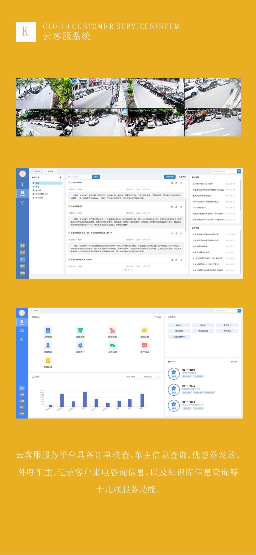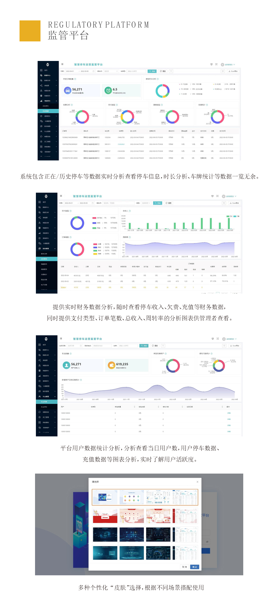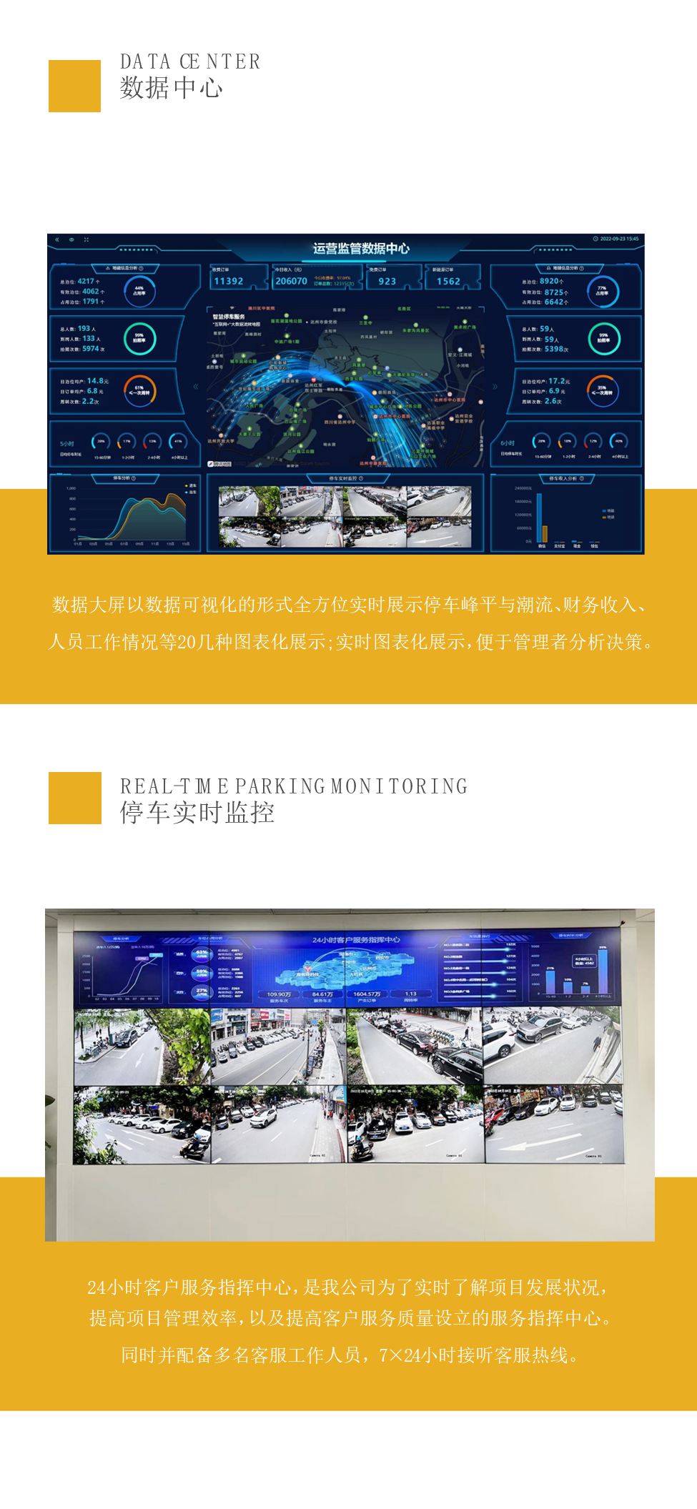 城市级智慧停车解决方案数据大屏以数据可视化的形式全方位实时展示停车峰平与潮流、财务收入、人员工作情况等20几种图表化展示;实时图表化展示,便于管理者分析决策。24小时客户服务指挥中心,实时了解项目发展状况提高项目管理效率,以及提高客户服务质量设立的服务指挥中心。同时并配备多名客服工作人员,7×24小时接听客服热线。