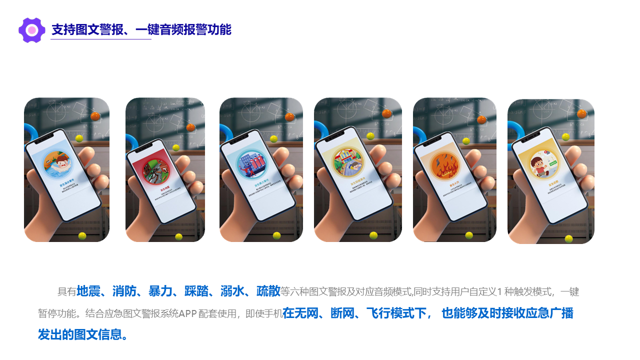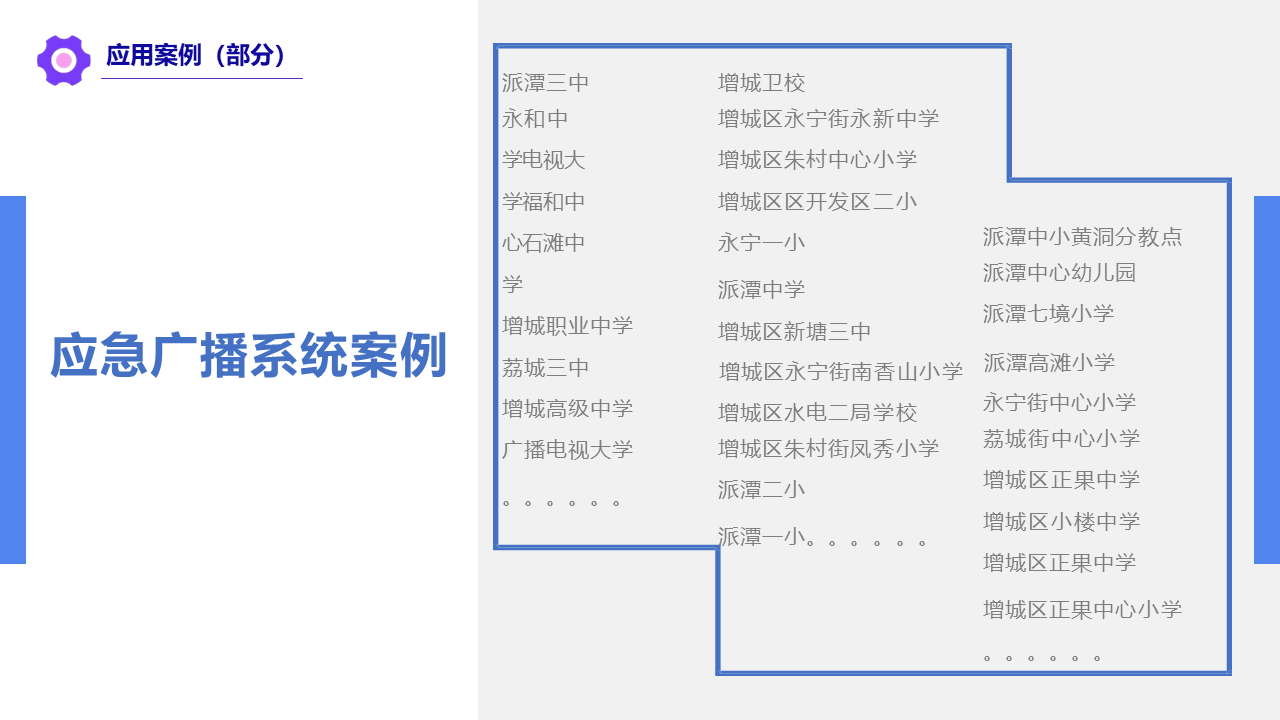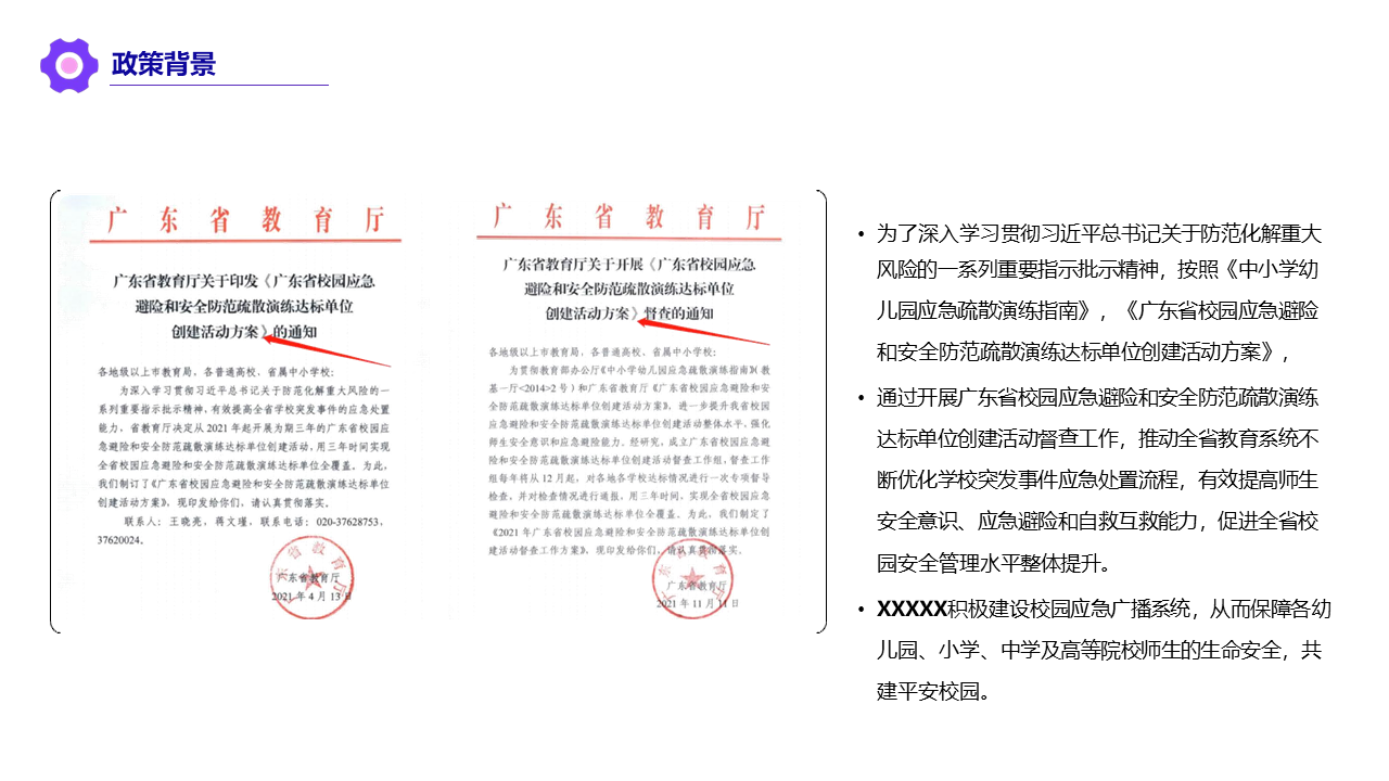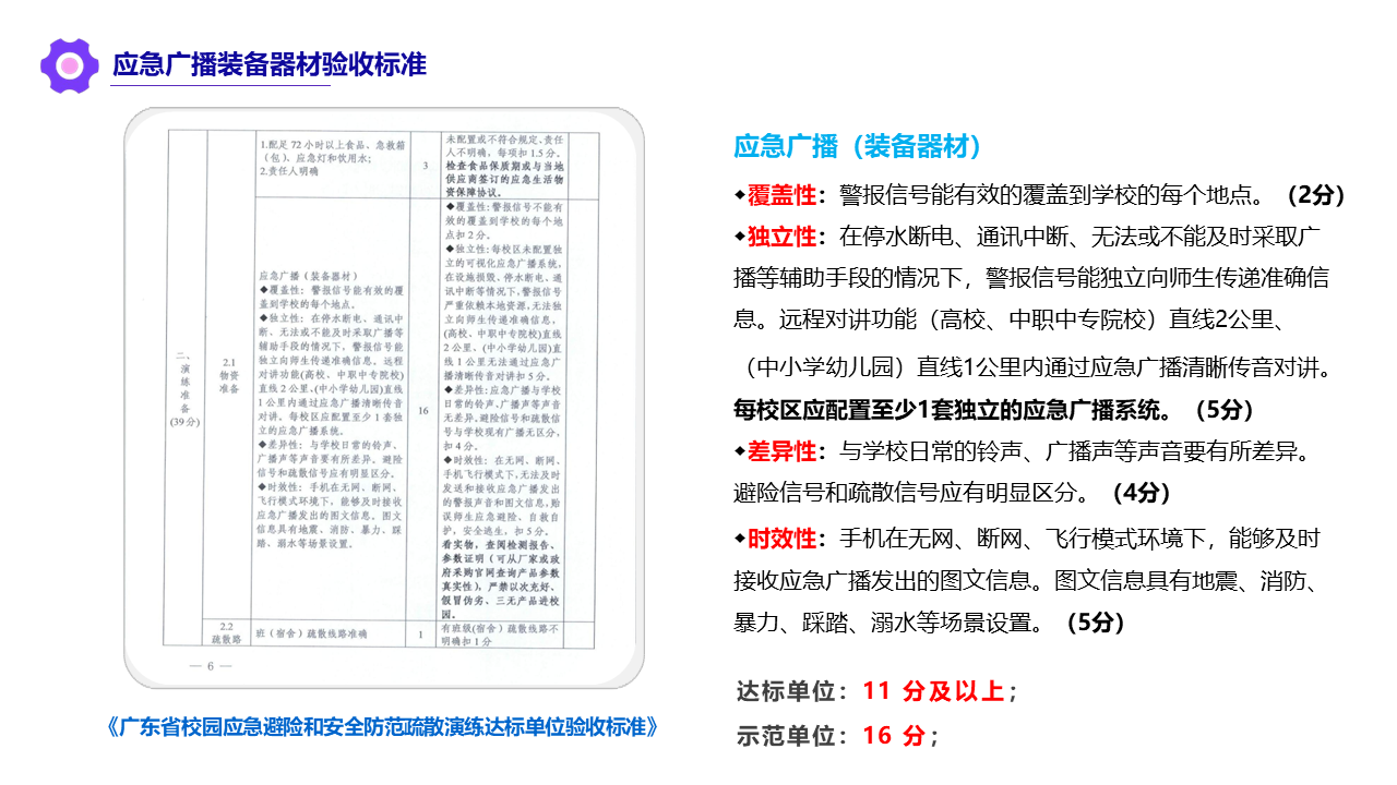 校园应急广播解决方案 积极建设校园应急广播系统,从而保障各幼儿园、小学、中学及高等院校师生的生命安全,共建平安校园。通过开展校园应急避险和安全防范疏散演练达标单位创建活动督查工作,推动全省教育系统不断优化学校突发事件应急处置流程,有效提高师生安全意识、应急避险和自救互救能力,促进校园安全管理水平整体提升。