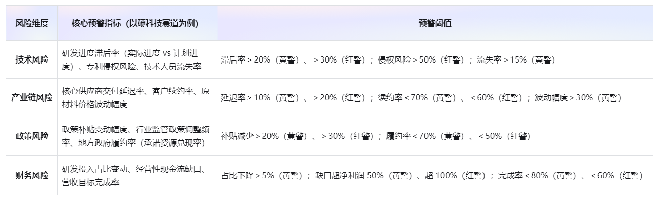 核心是围绕 “技术、产业链、政策、资源” 四大风险维度,设置预警指标,实时监控风险变化,避免 “事后发现”: