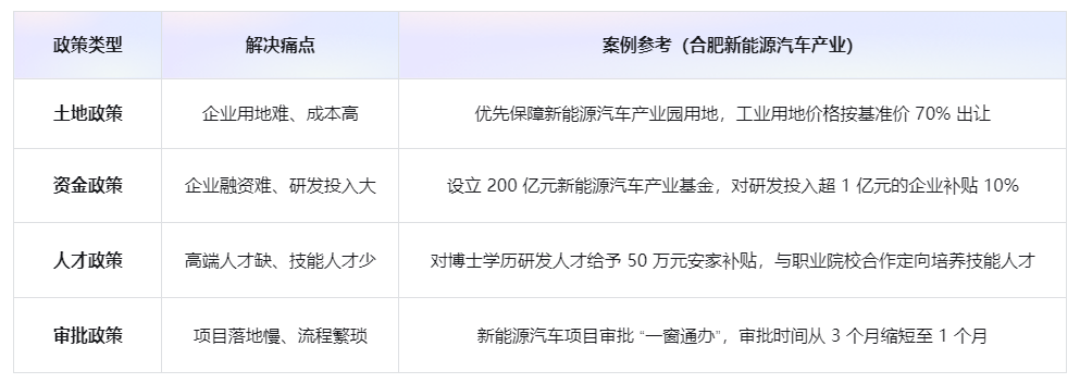 核心是 “政策匹配产业需求”,围绕 “企业痛点” 设计 “土地、资金、人才、审批” 等政策,避免 “无差别补贴”。