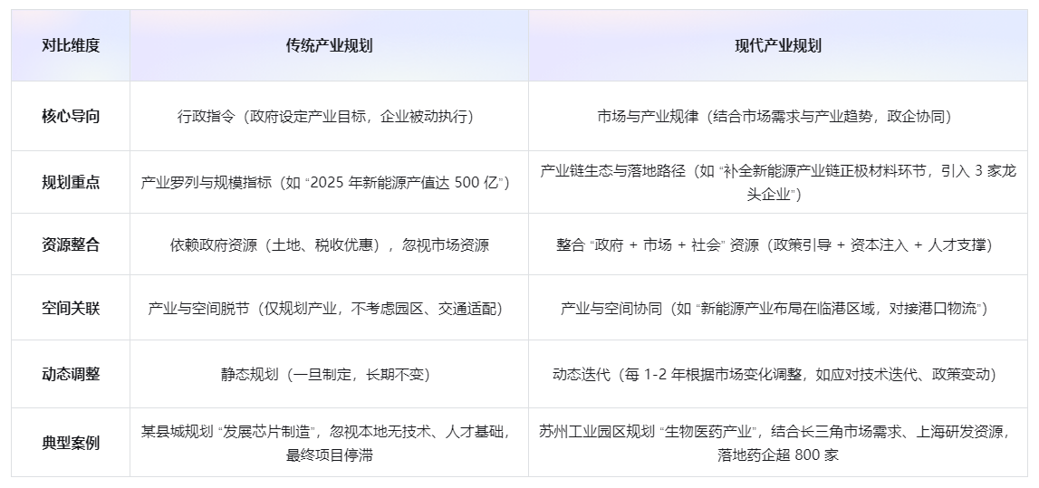 一、现代产业规划与传统产业规划的本质差异:从 “被动执行” 到 “主动协同”