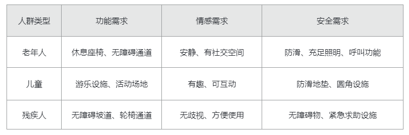 按 “人群类型(如老年人、儿童、残疾人)+ 需求类型(功能需求 / 情感需求 / 安全需求)” 构建矩阵,确保空间适配全人群。