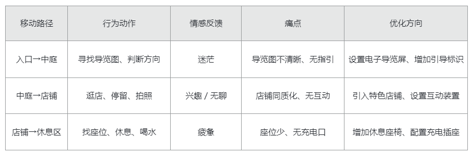 通过 “用户在空间中的移动路径 + 行为动作 + 情感反馈 + 痛点”,可视化空间体验过程,识别需优化的节点。