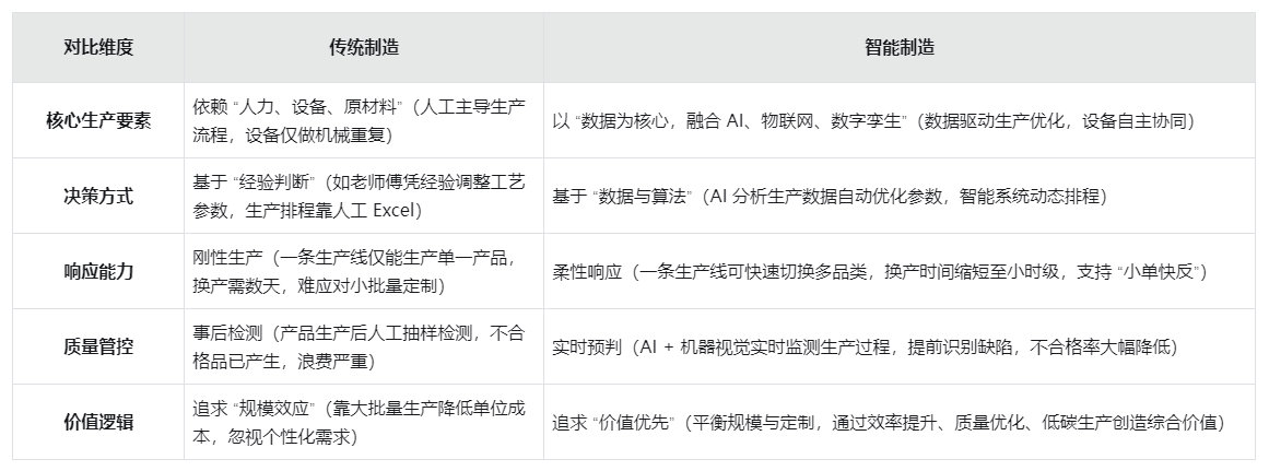 一、智能制造与传统制造的本质差异:从 “人工主导” 到 “智能驱动”