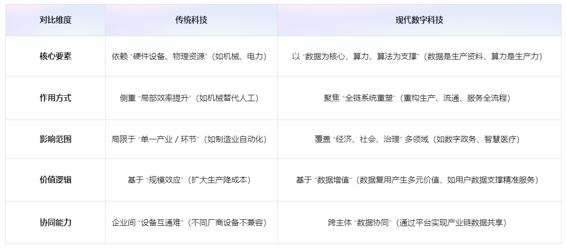 现代数字科技的 “数字性”,体现在核心要素、作用方式、影响范围、价值逻辑四个维度的根本突破,而非简单的 “技术迭代”: