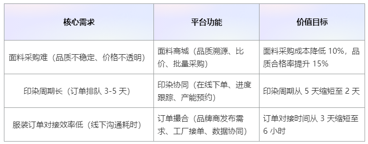 案例:犀牛智造平台定位 “帮服装企业‘小单快反’,订单交付周期从 30 天缩短至 7 天,库存降低 50%”;该定位精准击中 “服装企业怕库存、怕延误” 的痛点,上线半年吸引 200 家服装品牌入驻(含太平鸟、UR 等知名品牌),平台内小批量订单占比达 60%。