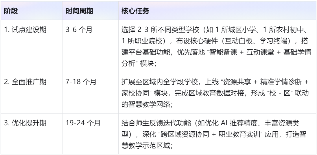 轻量化与低成本落地:针对农村学校、薄弱学校,提供 “轻量化方案”(如共享智能白板而非每间教室配备、优先开通基础资源功能),初期投入降低 40%;支持 “按需订阅”,学校可根据预算选择模块,灵活度高。