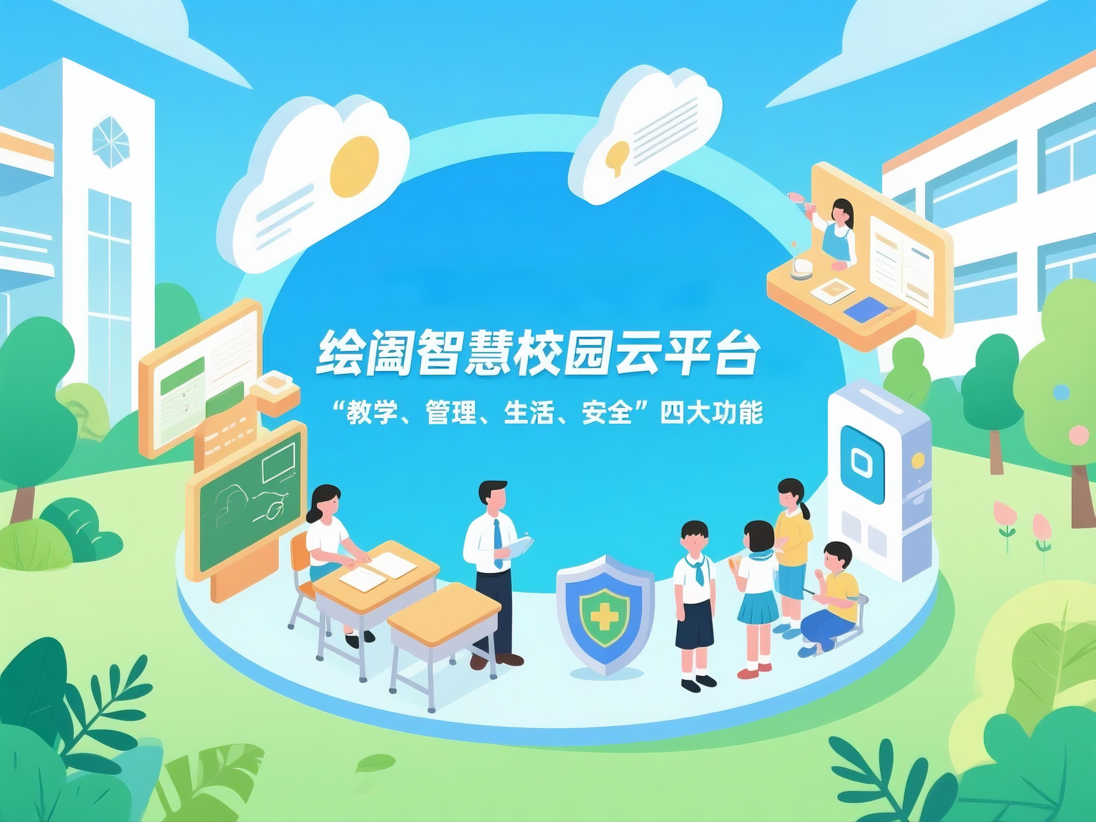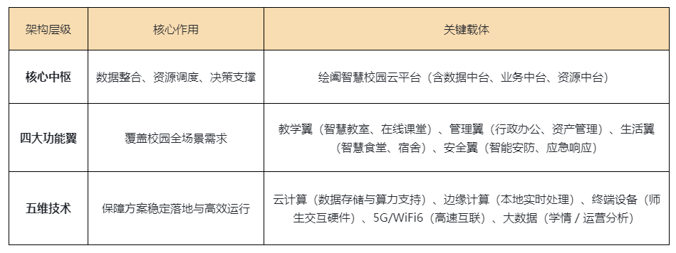 方案以 “绘阖智慧校园云平台” 为核心中枢,联动 “教学、管理、生活、安全” 四大功能翼,通过 “云 - 边 - 端 - 网 - 数” 五维技术协同,构建一体化智慧校园生态: